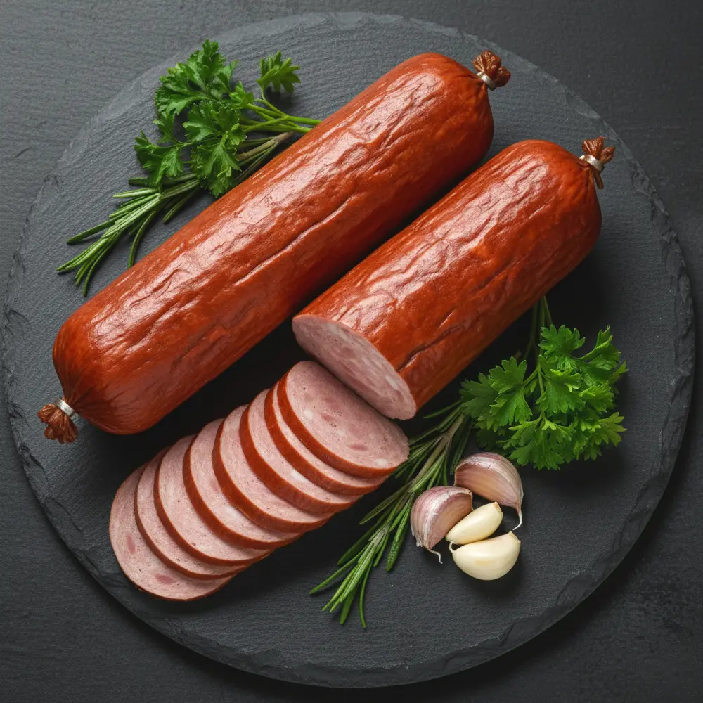Säuerungsmittel: Zitronensäure, Schweinefleisch 92 %, Nitritpökelsalz (Kochsalz, Konservierungsstoff E250), Gewürze, Knoblauch, Rauch, Ascorbinsäure, Mononatriumglutamat, Diphosphate, Echtes Karmin, Stärke, Gewürzextrakte