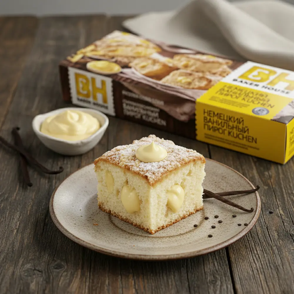 Dieser traditionelle deutsche Kuchen wird nach bester Hausmannskost-Tradition hergestellt. Der saftige Vanille-Biskuitkuchen ist mit Zucker-Baiser bestreut und harmoniert perfekt mit der Vanillepudding-Füllung. Dieser Kuchen eignet sich perfekt für Teepartys und wird bei Gästen und Familie ein Hit sein.