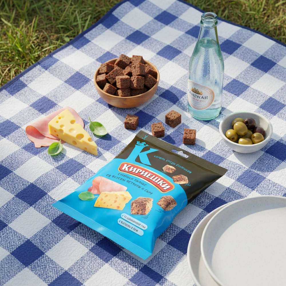 Entdecken Sie die knusprigen Brotcroutons Kirieschki mit Schinken- und Käsegeschmack, die Ihnen einen intensiven Snackmoment voller Geschmack bieten.