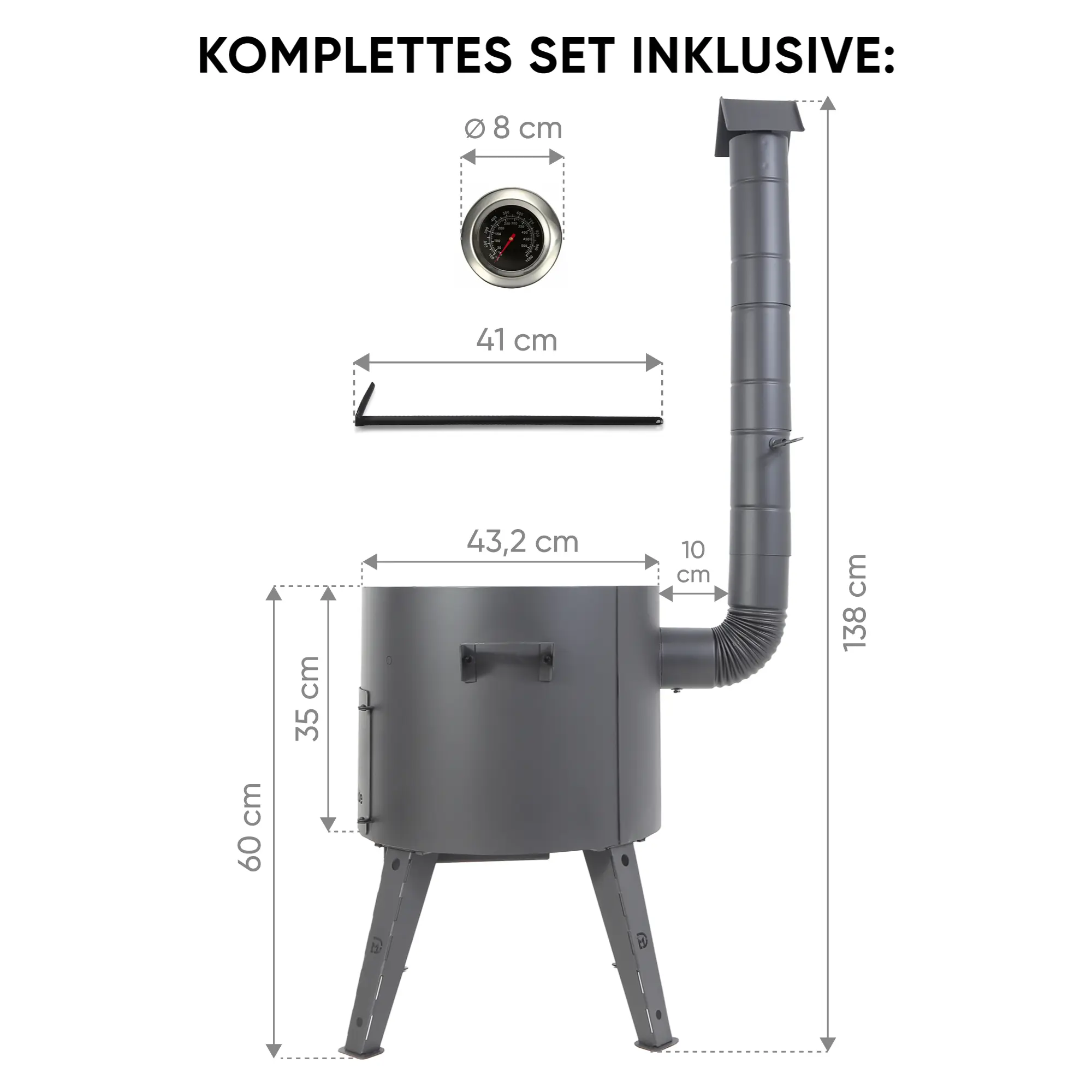 Der Utschak besteht aus einem robusten Metallzylinder und kommt als komfortables Komplett-Set: abnehmbare Standfüße, Tür, Feuerhaken und Thermometer sind bereits enthalten.