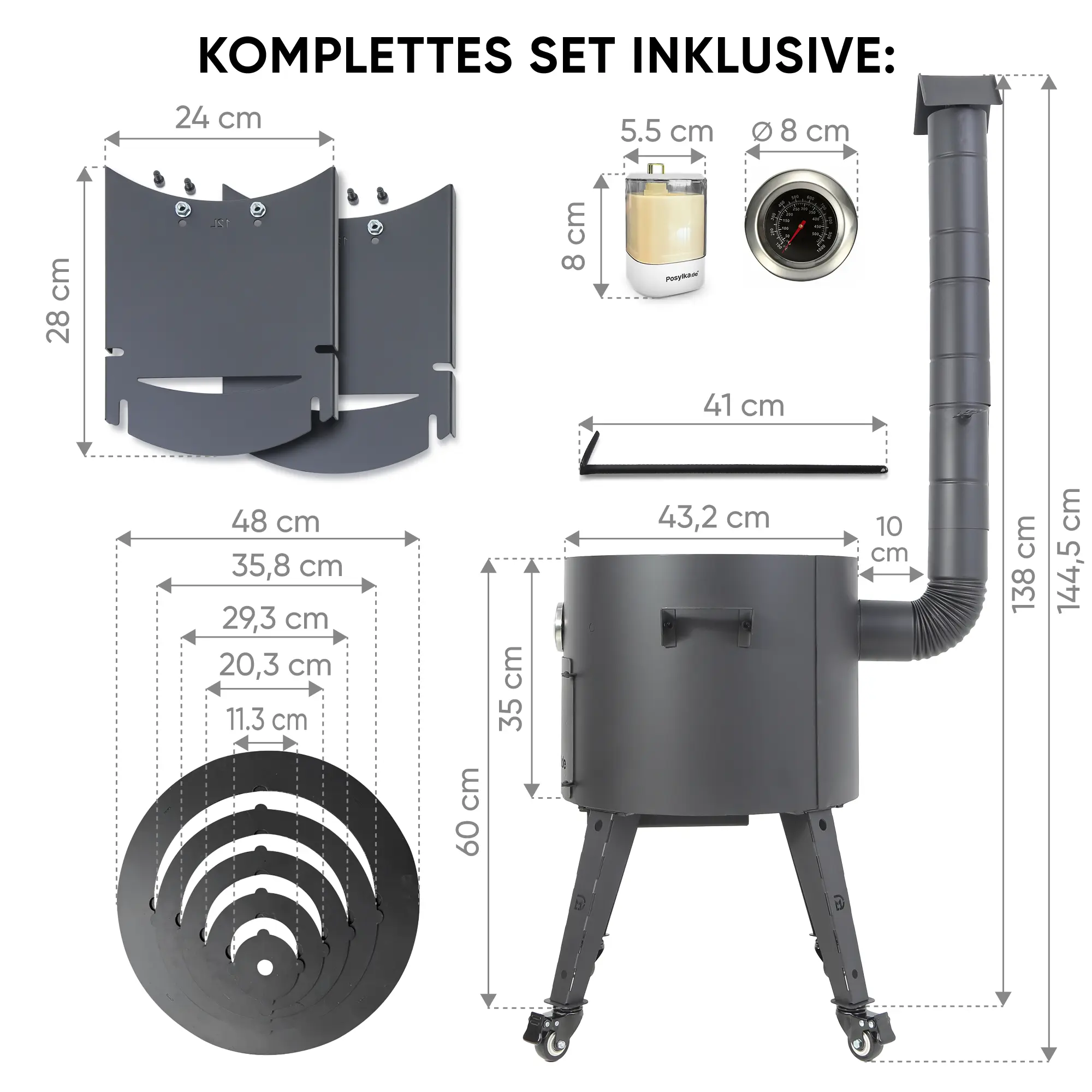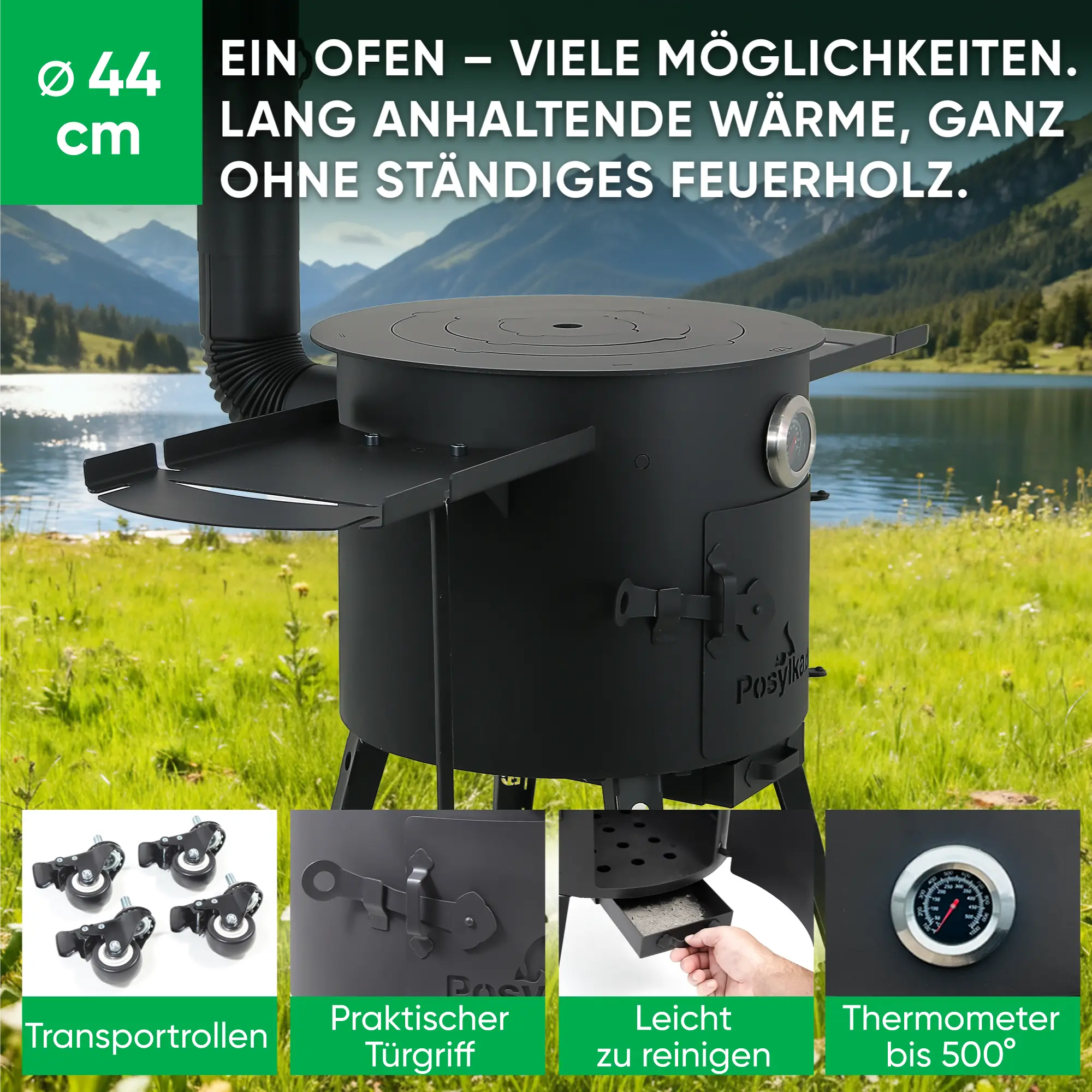 Feuerofen mit Rohr Ø 44 cm + Herdplatte+ Thermometer + Rollen: 4 St + Ablagetisch: 2 St + Zahnstocherspender