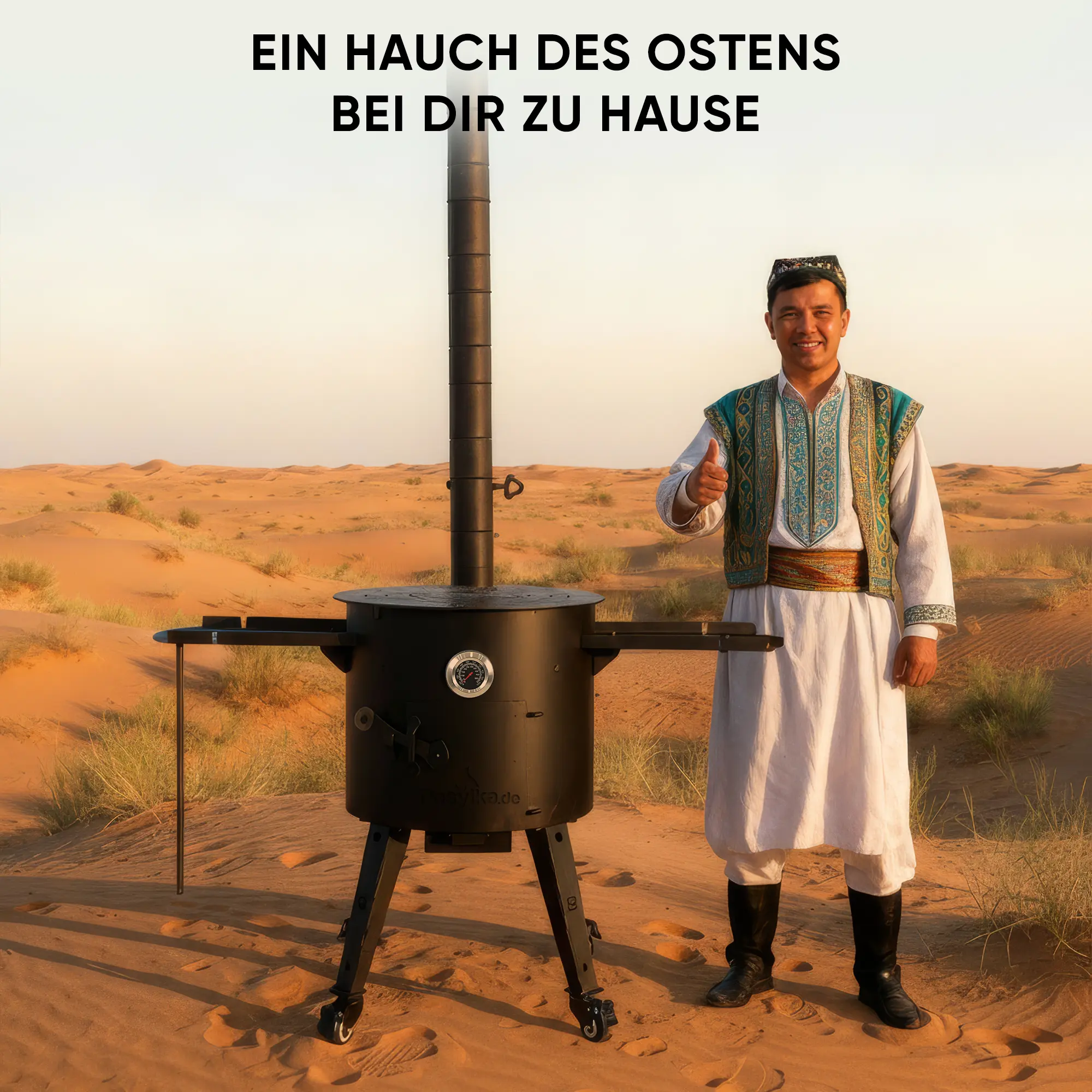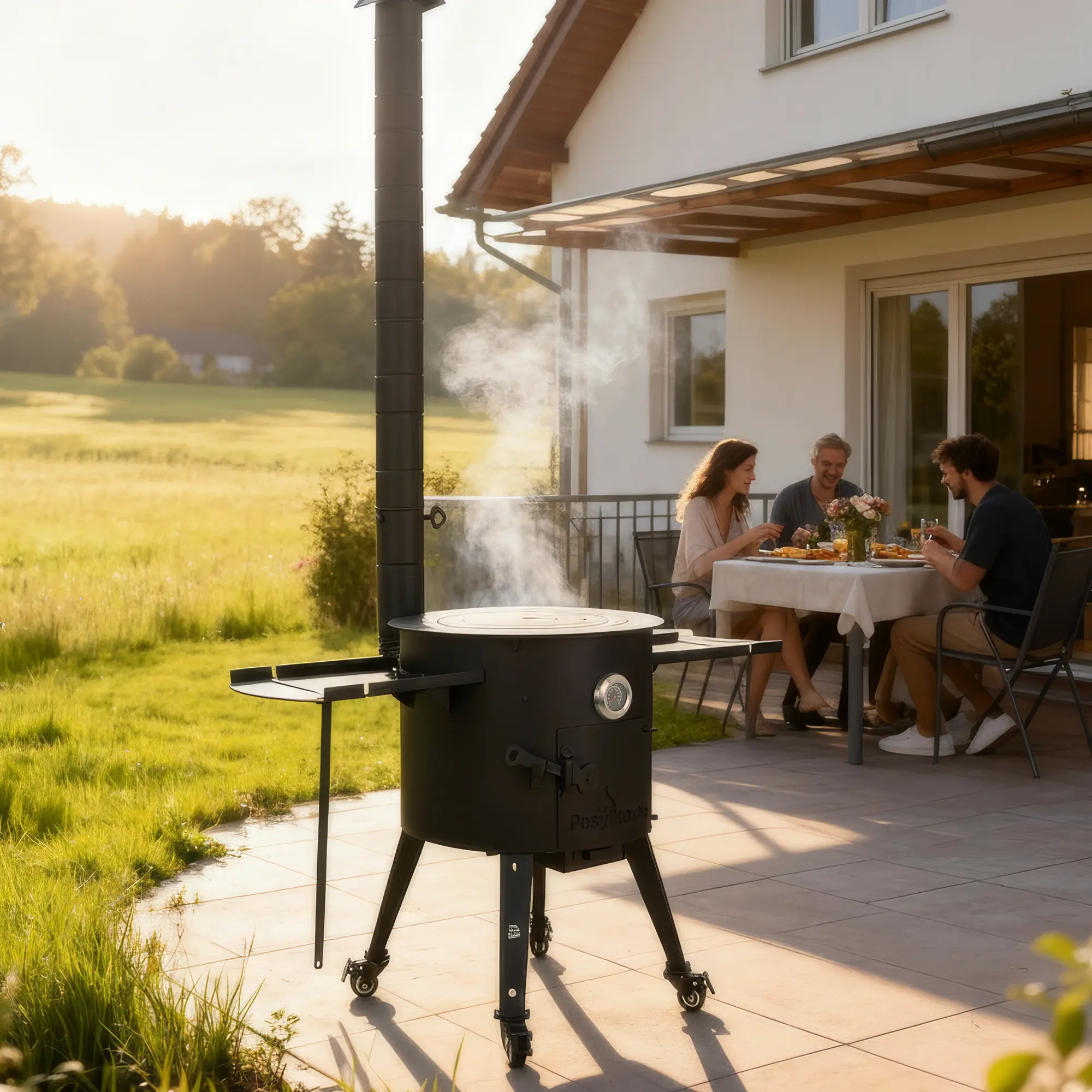 Das exklusive Set – der KazanoFF-Ofen mit verlängertem Rauchrohr und Premium-Zubehör – ist die perfekte Lösung für alle, die echten Outdoor-Genuss lieben. Ideal geeignet für einen 16-Liter-Kessel Zum Lieferumfang des Ofens gehören zwei abnehmbare Ablagetische, vier Transportrollen, ein hitzebeständiges Thermometer, eine Stahlplatte mit Ringen sowie ein automatischer Zahnstocher-Dispenser.