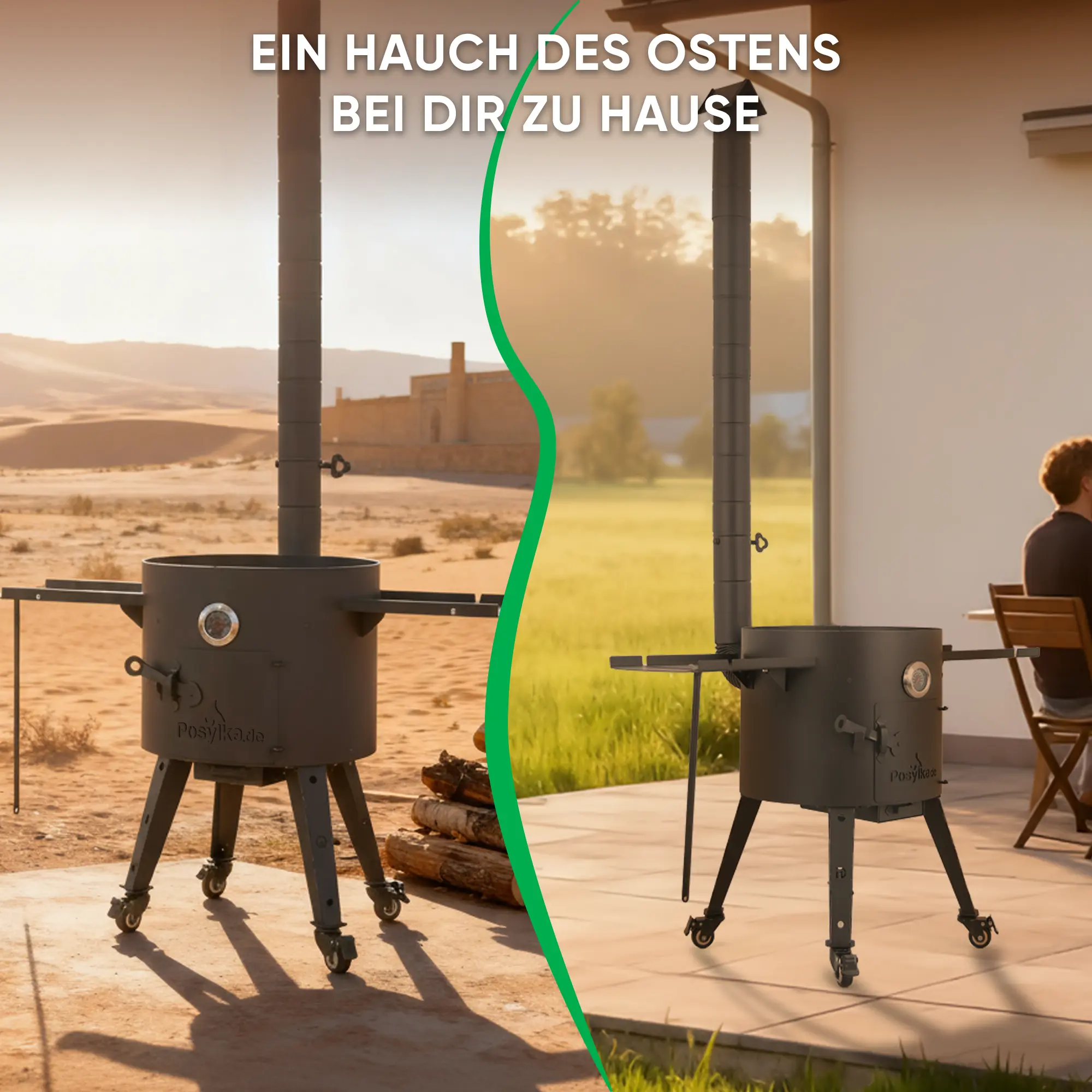Das exklusive Set – der KazanoFF-Ofen mit Kaminrohr und Premium-Zubehör – ist die perfekte Lösung für alle, die echten Outdoor-Genuss lieben. Ideal geeignet für einen 16-Liter-Kessel Der Ofen wird aus besonders widerstandsfähigem 2-mm-Stahl gefertigt und ist damit bereit für viele Jahre intensiver Nutzung.
