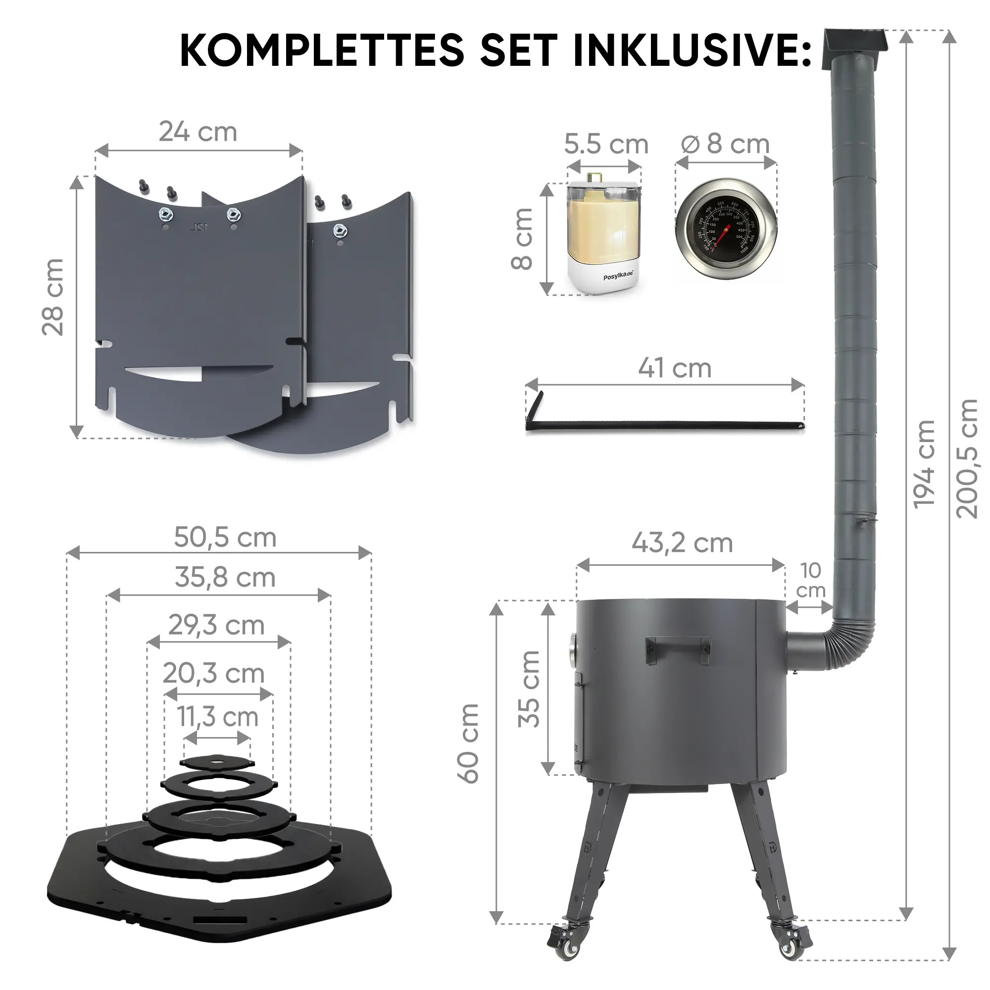 Feuerofen mit Rohr Ø 44 cm Rohr + Rohrverlängerung + Herdplatte + Thermometer + Rollen: 4 Stück + Tisch; 2 Stück + Zahnstocherspender