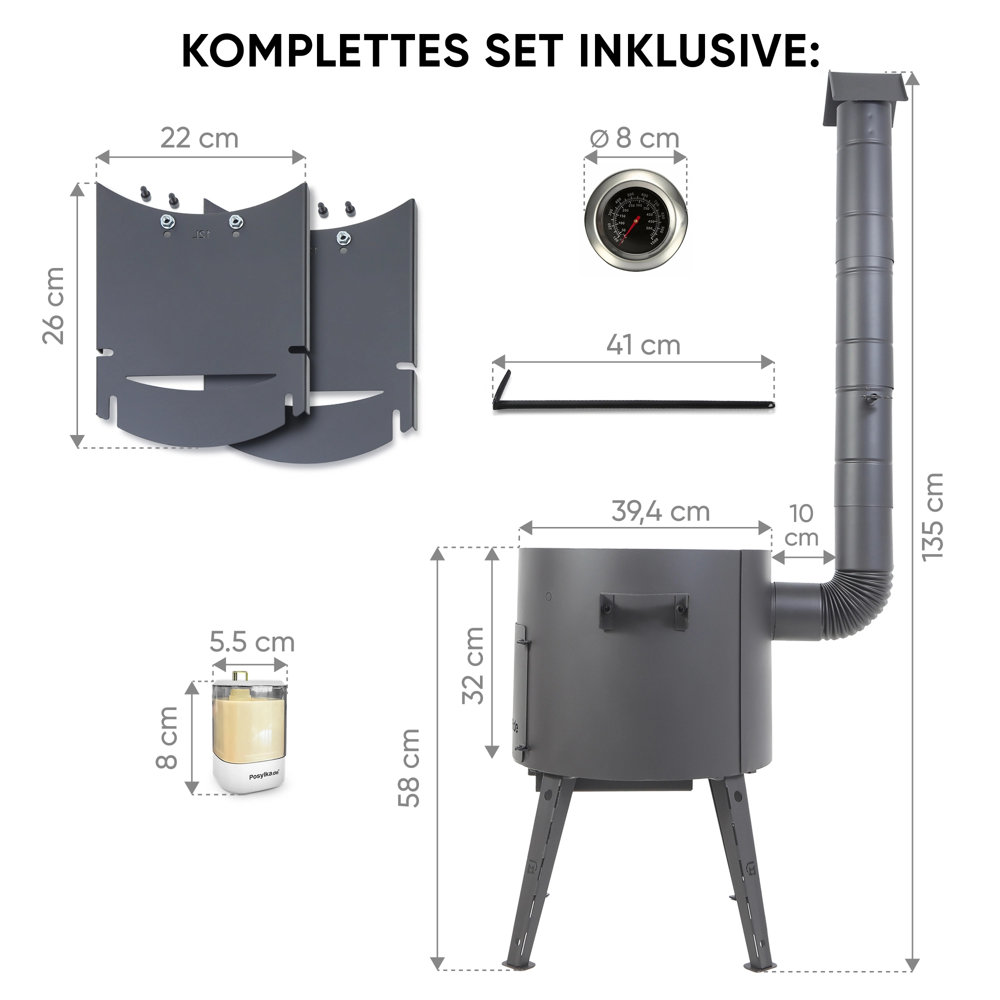 Das Modell besteht aus einem robusten Metallzylinder und wird als praktisches Komplett-Set geliefert: abnehmbare Standfüße, Tür, Feuerhaken, Thermometer, zwei abnehmbare Seitentische sowie ein automatischer Zahnstocher-Dispenser gehören bereits dazu.