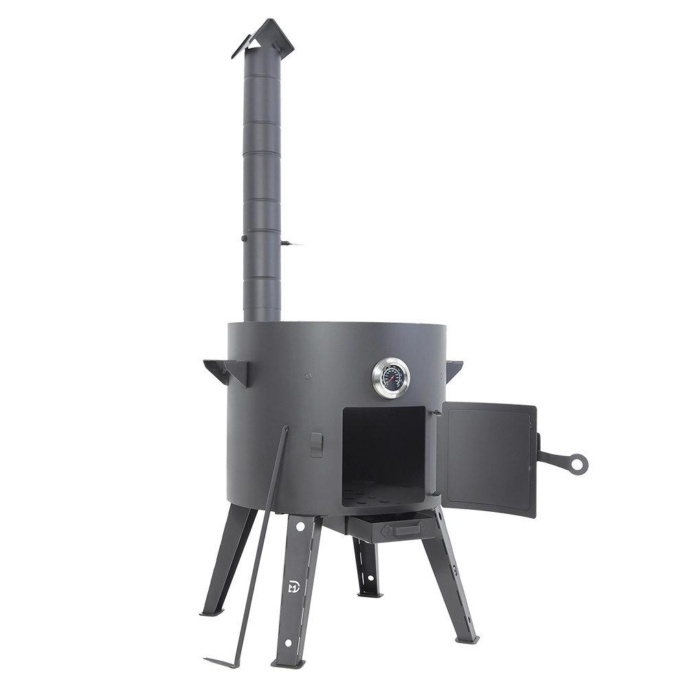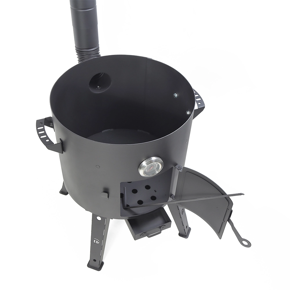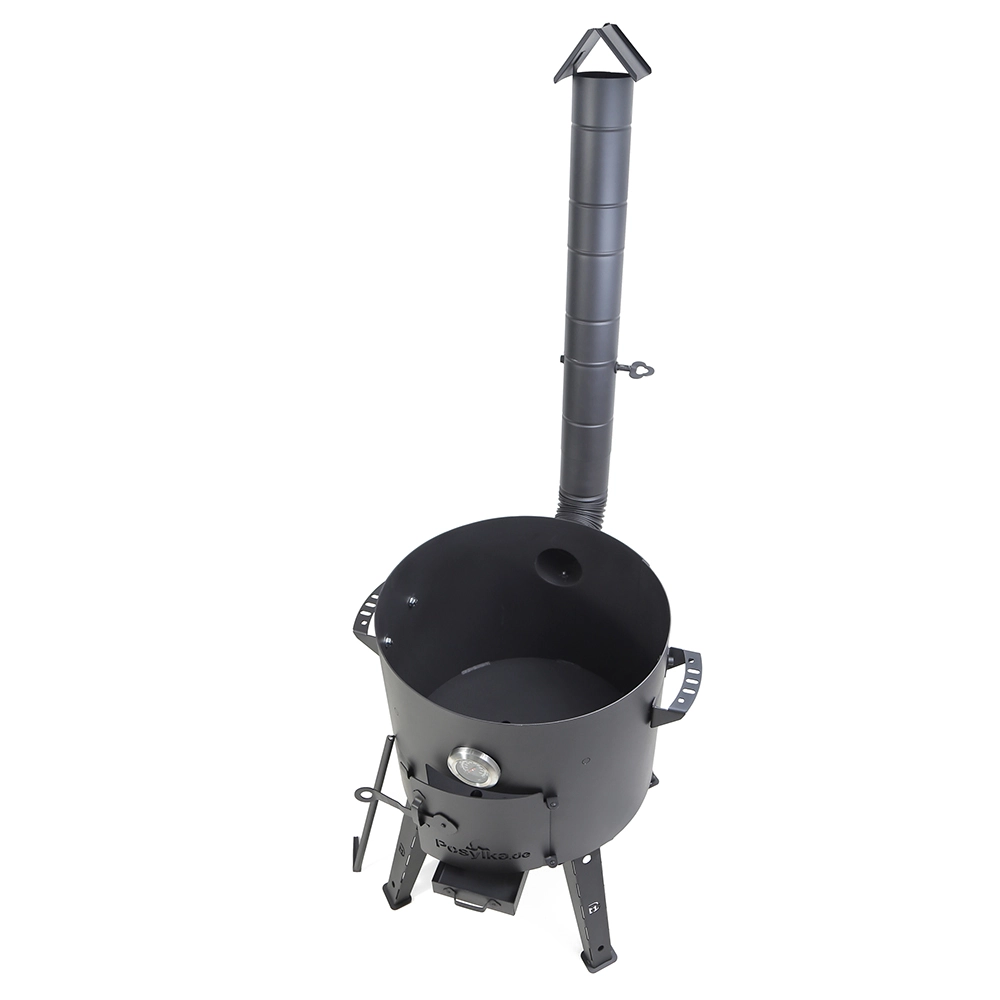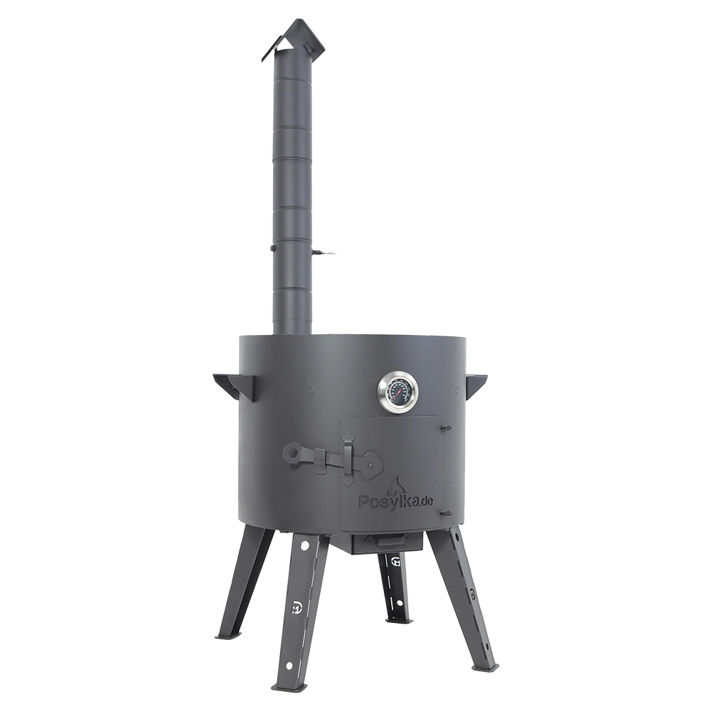 Der Utschak besteht aus einem robusten Metallzylinder und kommt als komfortables Komplett-Set: abnehmbare Standfüße, Tür, Feuerhaken und Thermometer sind bereits enthalten.