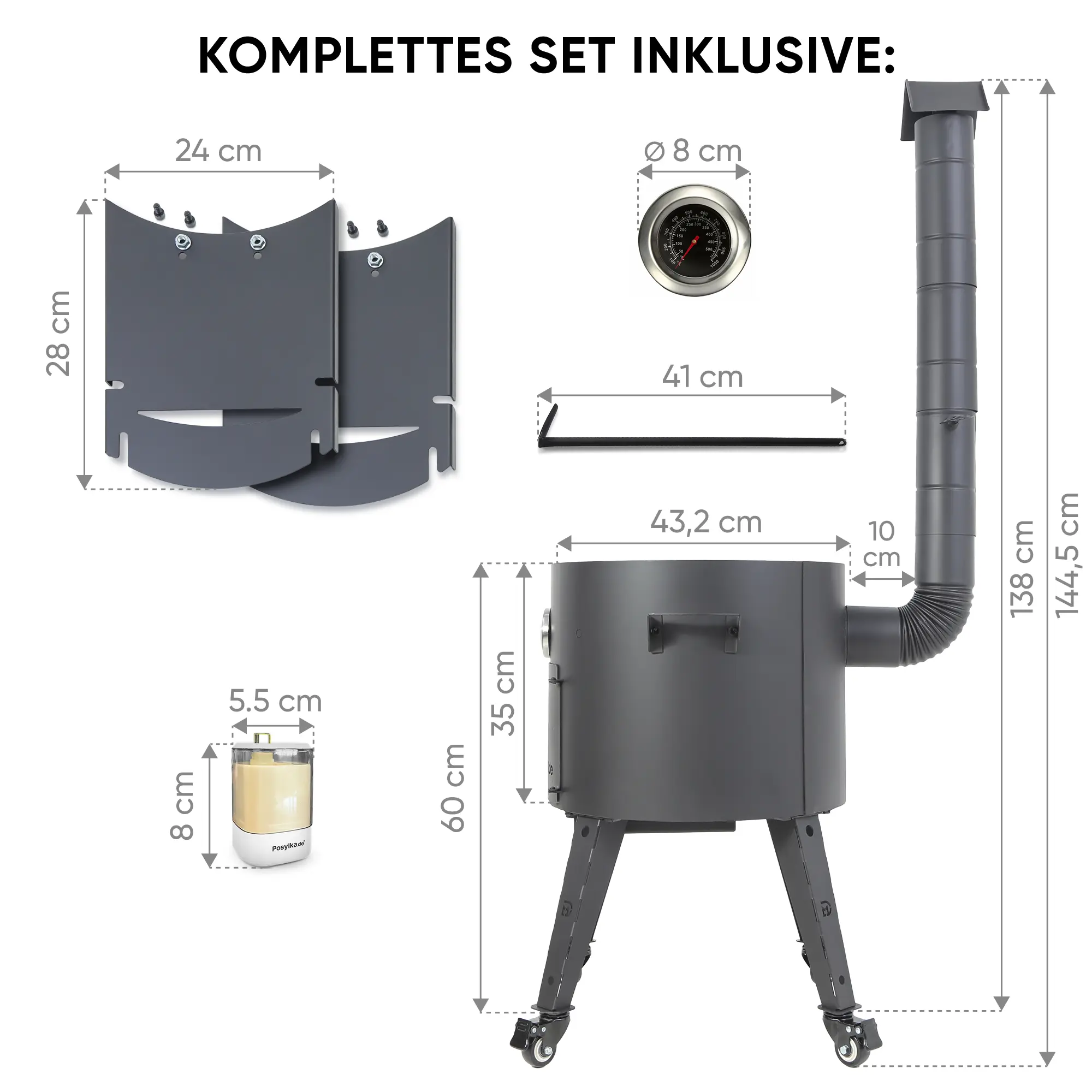 Im Set enthalten sind außerdem ein integriertes Thermometer, Transportrollen für leichtes Bewegen sowie praktische abnehmbare Seitentische.