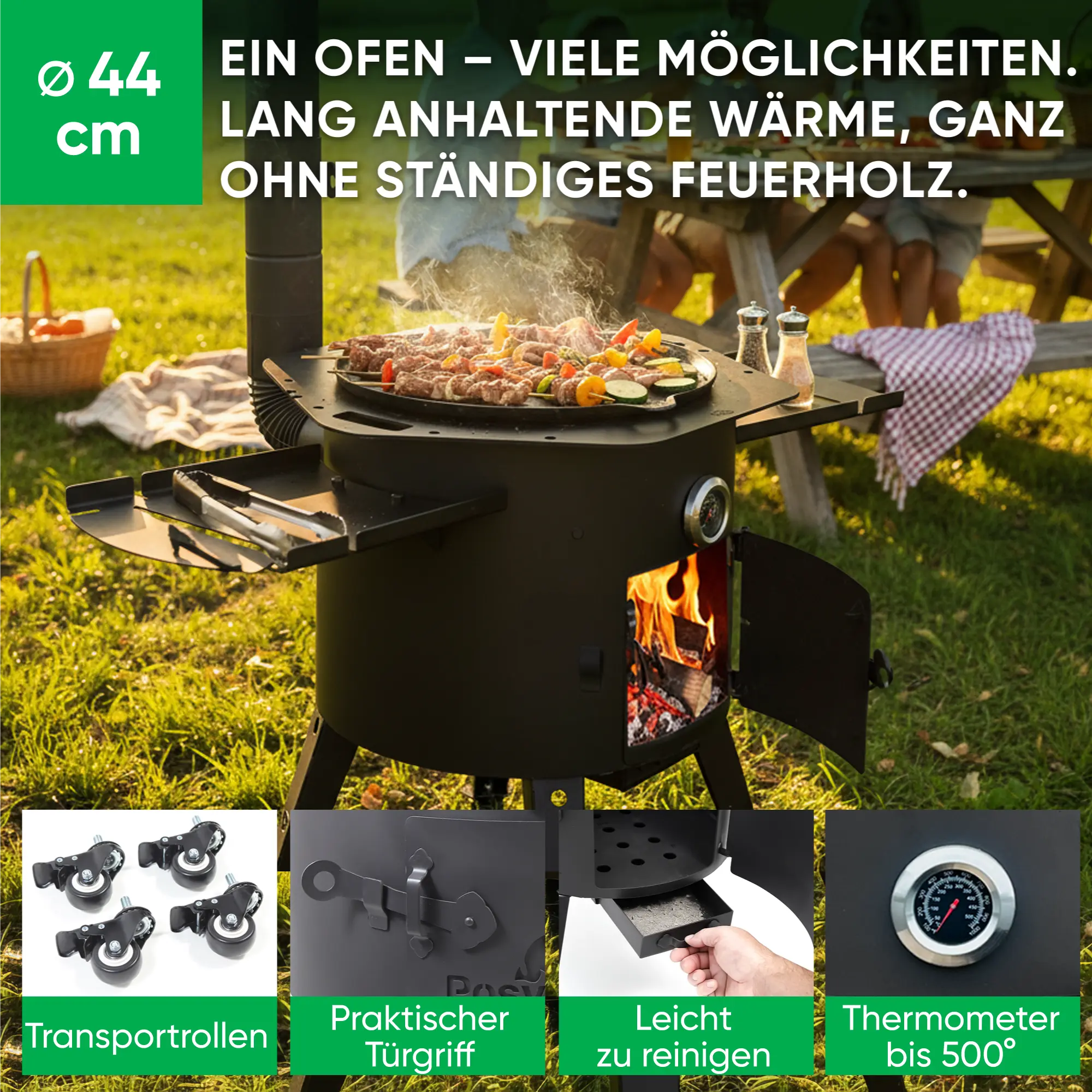 Feuerofen Utschak Ø 44 cm mit Abzugsrohr, für Kasan 16 l, Thermometer, Transportrollen, Ablagetischen, Ofenplatte