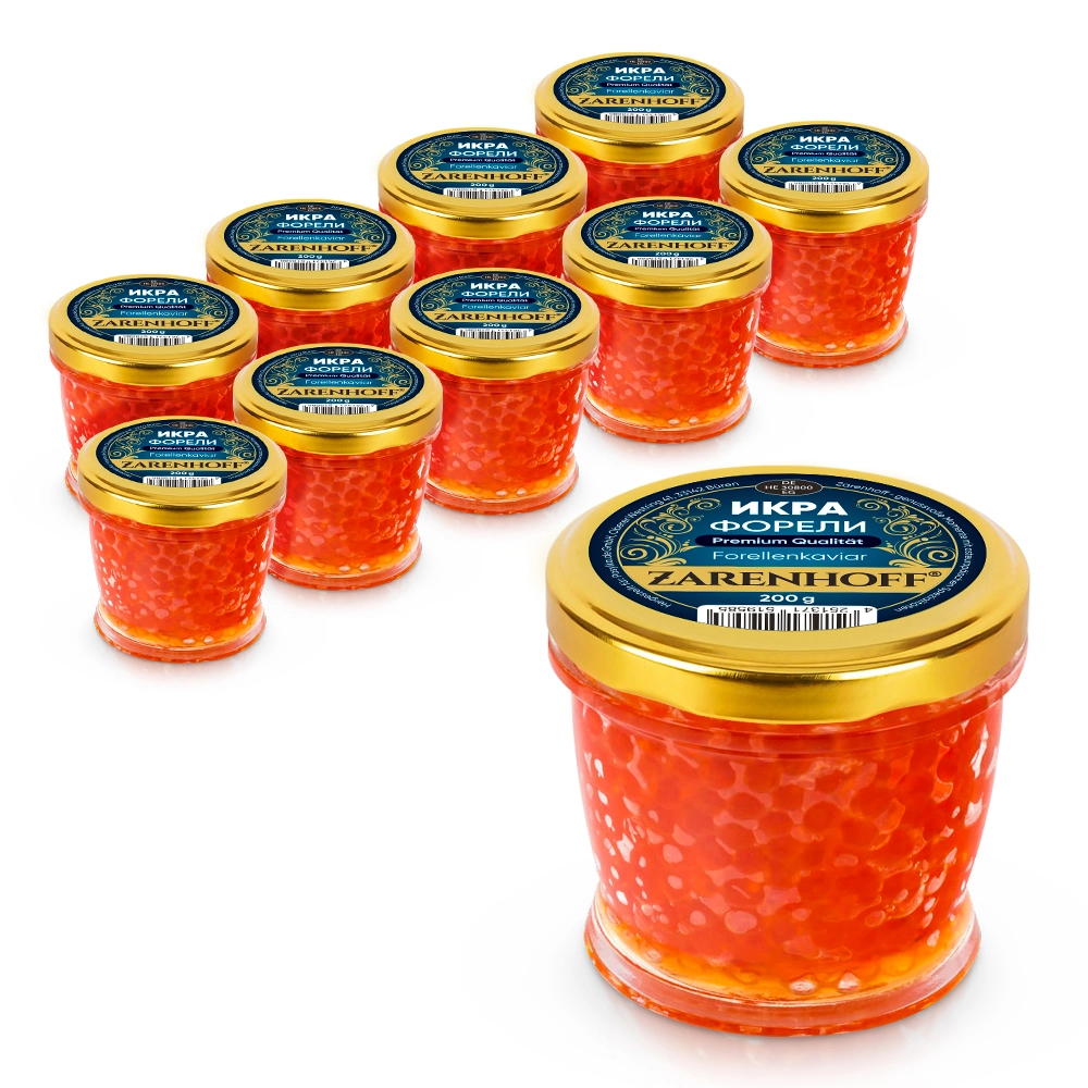 Sie können bei uns hochwertigen Forellenkaviar kaufen, der von Fischen aus spezialisierten Farmen stammt und alle Standards einhält. Der Premium Forellen Kaviar Zarenhoff® bietet immer herausragenden Geschmack, bestätigte Qualität und einen fairen Preis. Sie können roten natürlichen Kaviar jetzt direkt in Deutschland kaufen, und wir werden sicherstellen, dass Sie ein wirklich frisches und geprüftes Produkt erhalten, indem wir jeden Kaviarbehälter in eine spezielle Thermoverpackung mit Kühlpacks verpacken.