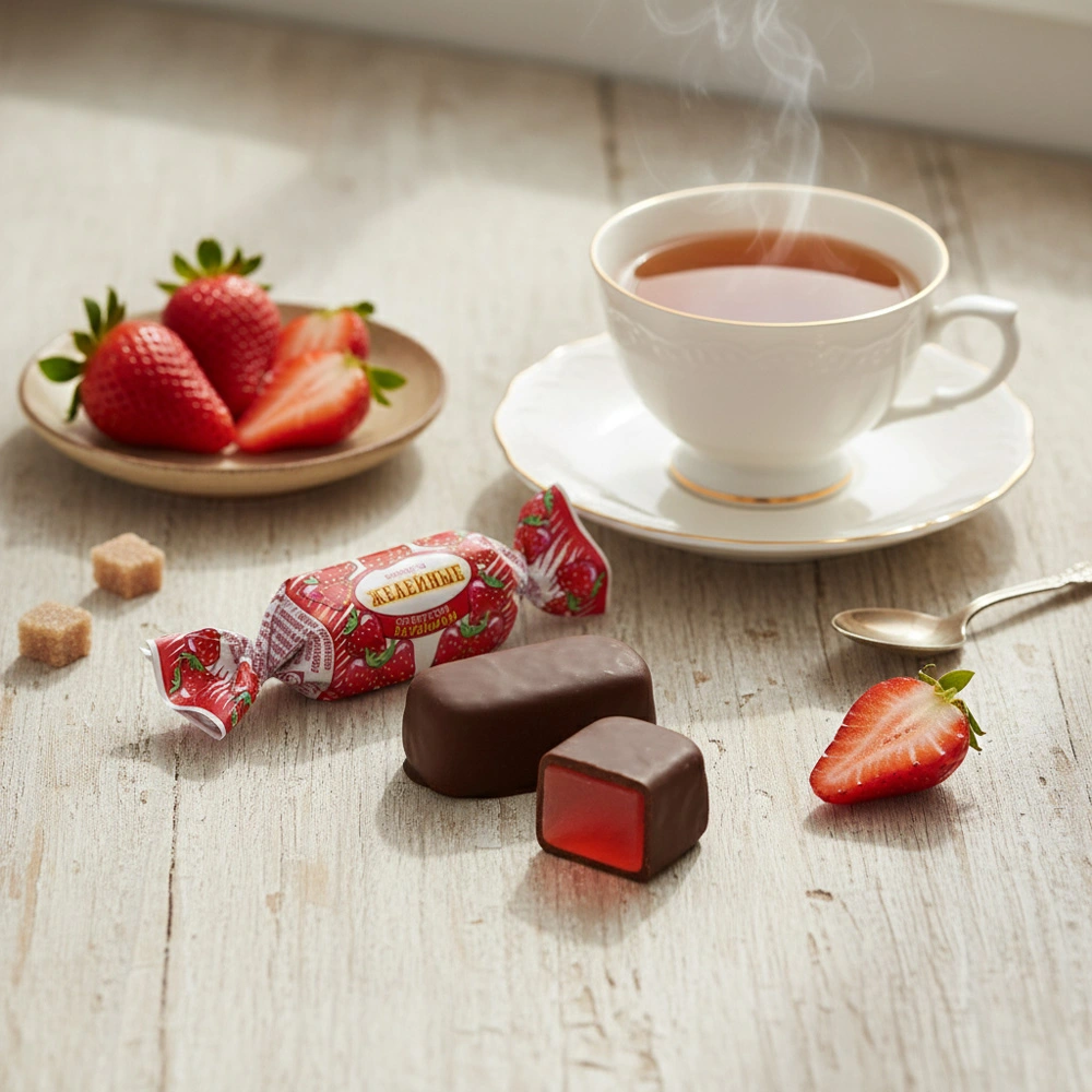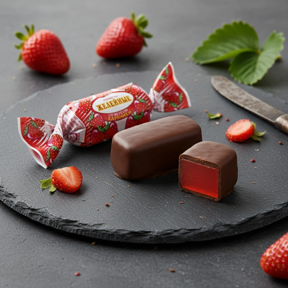 Взяла эти желейные конфеты со вкусом клубники в первый раз "на пробу" и была приятно удивлена. Вкус и консистенция довольно классические, но уровень сладости как раз тот, что нужно - можно спокойно наслаждаться, и не становится приторно уже после пары штук.