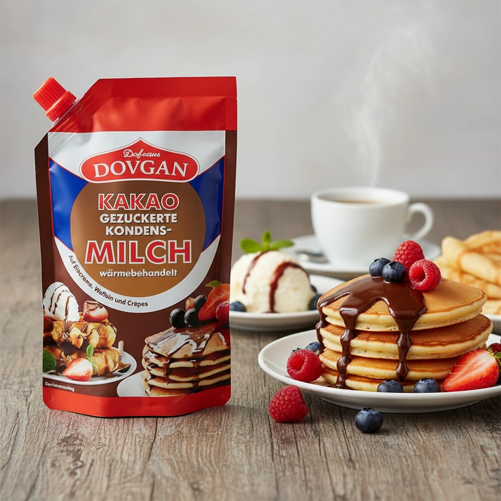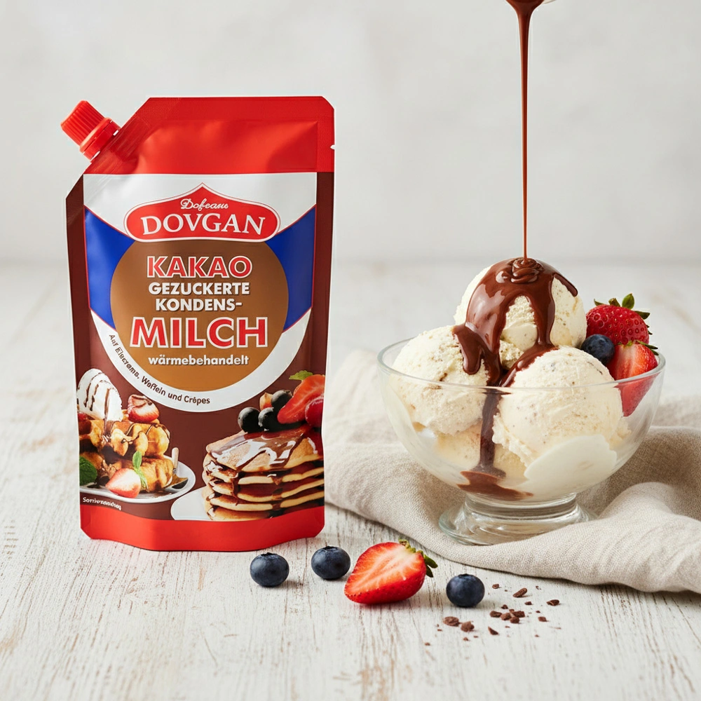 Unsere gezuckerte Kondensmilch mit Kakao - eine köstliche Bereicherung für Ihre Küche! Die Mischung aus gezuckerter Kondensmilch und aromatischem Kakao verleiht Ihren Lieblingsrezepten einen intensiven Schokogeschmack und eine angenehme Süße. Ob als Zutat für Schokoladenkuchen oder als Topping für Eis - dieses Produkt ist vielseitig einsetzbar und sorgt für ein unvergleichliches Geschmackserlebnis. Das handliche Doypack-Format macht die Aufbewahrung einfach und bequem.