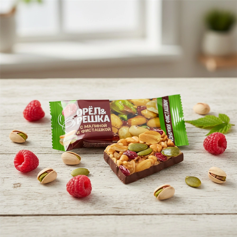 Kürbiskerne, Pistazien, Gemahlener Keks 36,5 % (Weizenmehl, Zucker, Palmfett, Speisesalz, Aroma, Karamell, Antioxidierungsmittel: Weinsteinsäure), Erdnüsse geröstet, Kandierte Frucht, Stärkesirup, Süßwarenfett (Pflanzenfett (частично гидрогенизированные подсолнечное масло, Sojaöl, Palmöl/Palmolein) рафинированный дезодорированный, Palmöl, Raffiniertes desodoriertes Sonnenblumenöl, Е471, Е475, Antioxidationsmittel: Е320, Е321), Himbeeren, Aromа, Zuckerglasur