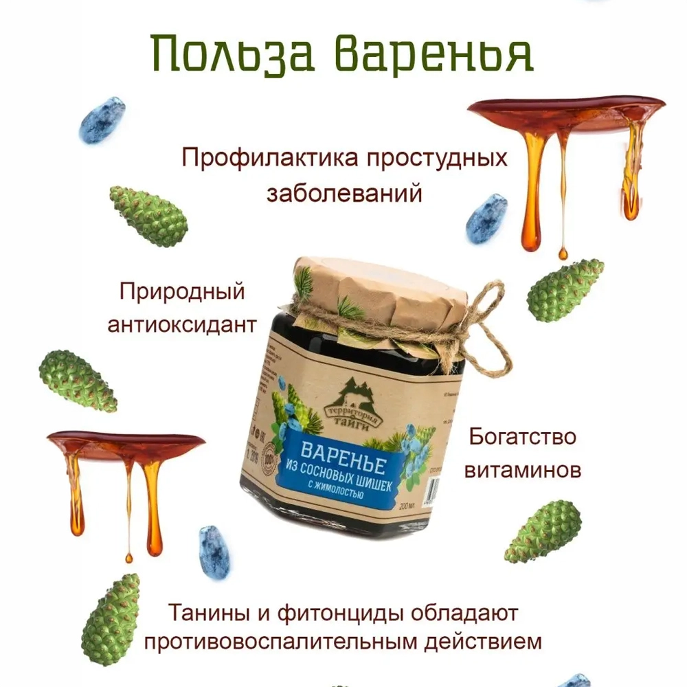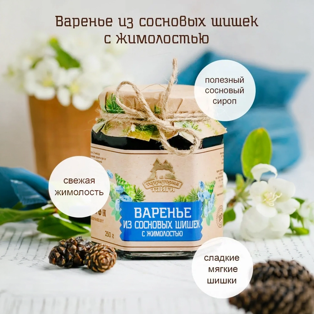 Schon seit langer Zeit ist diese süße Spezialität wegen ihres hohen Gehalts an Vitaminen und Spurenelementen sehr geschätzt. Für unsere Konfitüre verwenden wir ausschließlich natürliche Zutaten - junge Kiefernzapfen, Heckenkirsche (Josta-Beeren), dazu Zucker und natürlicher Zitronensaft.