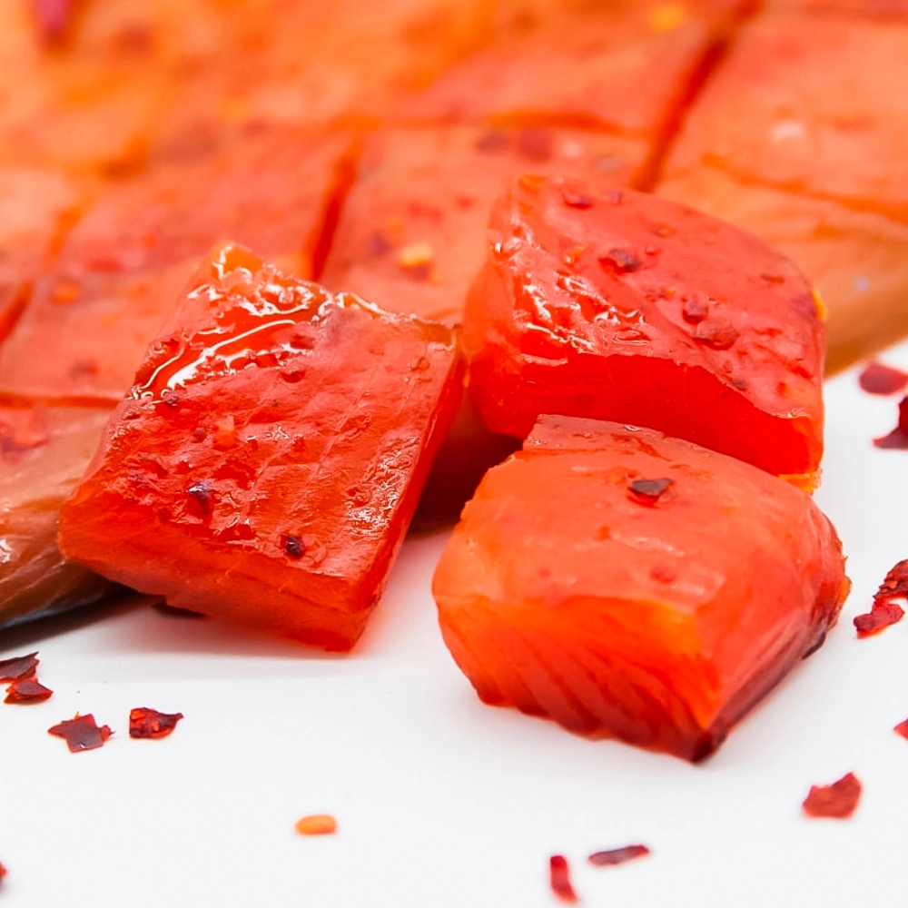 In unserer Produktion werden die IFS-Standards (International Food Standard) strikt eingehalten: Der Zubereitungsprozess erfolgt in völliger Übereinstimmung mit dem traditionellen Rezept, jedoch unter Bedingungen absoluter Sterilität, die durch moderne Technologien garantiert wird. Das Fleisch wird sorgfältig von Hand gereinigt und nach der Malossol-Methode gesalzen und dann bei einer Temperatur von nicht mehr als 35 ℃ lang getrocknet. Die speziell gewählte Schnittmethode des Fischfleisches fördert eine gleichmäßige Verteilung der Gewürze und die Zubereitung des Produkts, während die Haut erhalten bleibt, um die Integrität und Attraktivität des Produkts zu gewährleisten.