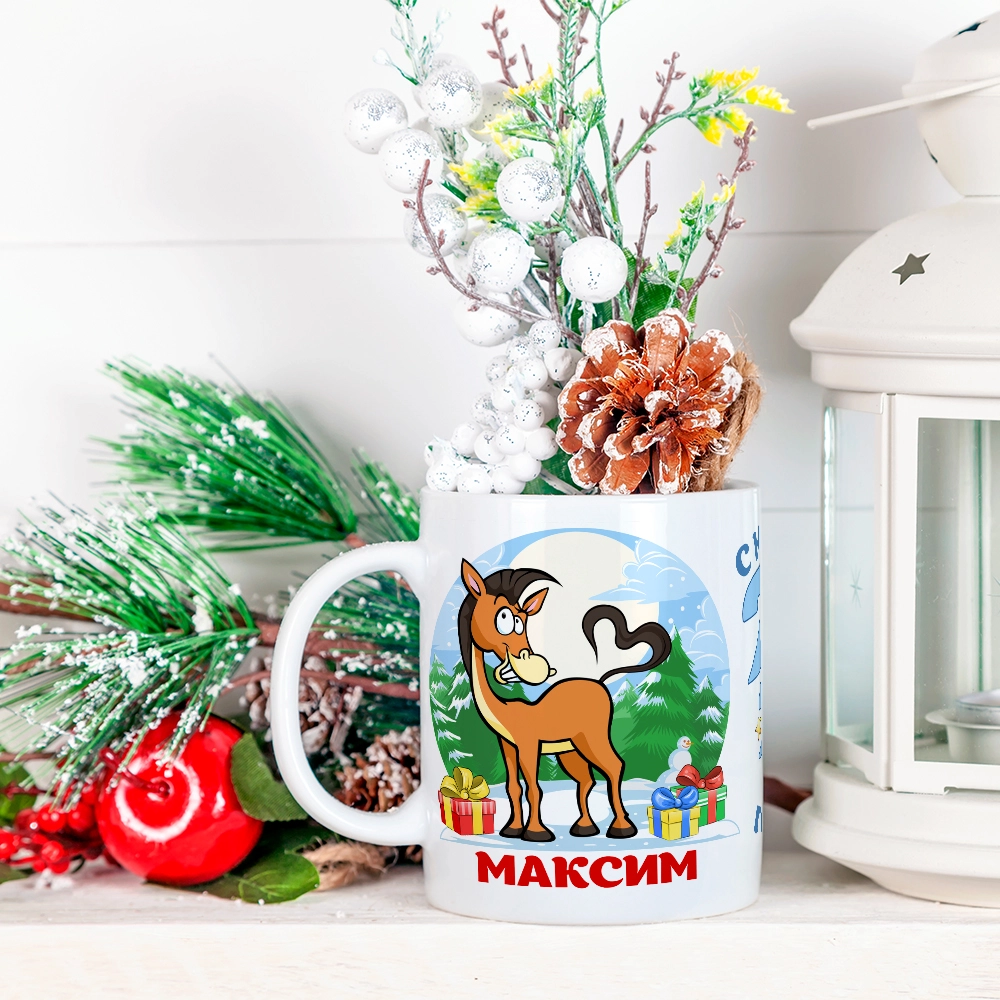 Namenstasse - Frohes Neues Jahr 2026!, Fröhliches Pferdchen mit Geschenken, Keramik, 330 ml