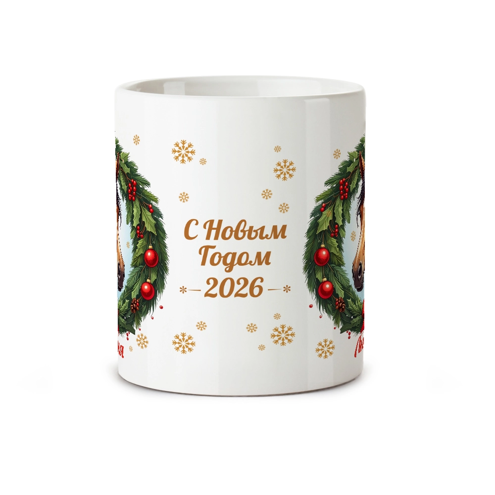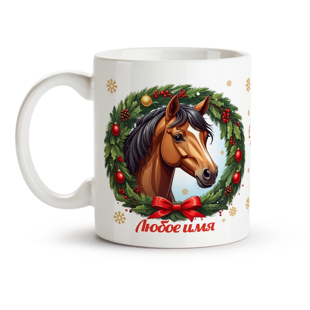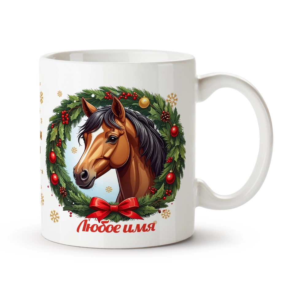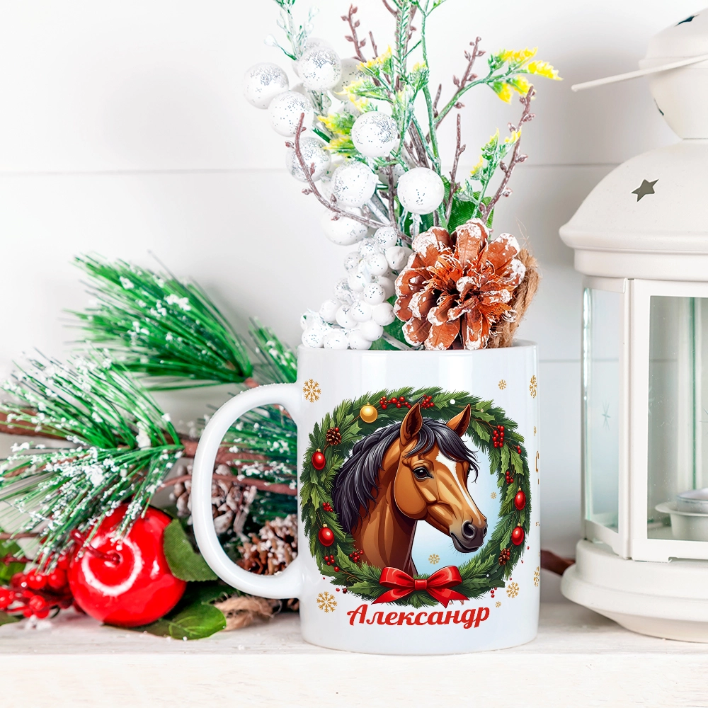 Namenstasse - Frohes Neues Jahr 2026!, Pferd mit Weihnachtskranz, Keramik, 330 ml