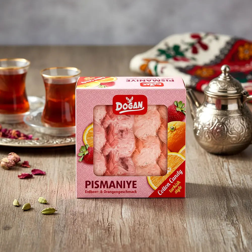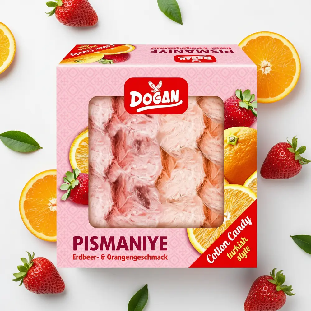 Entdecken Sie eine traditionelle orientalische Süßigkeit neu interpretiert: DOGAN Pismaniye vereint hauchzarte, feine Zuckerfäden aus Weizenmehl mit einem köstlichen Erdbeer- und Orangengeschmack. Eine süße Versuchung mit fluffiger Textur und fruchtiger Note.