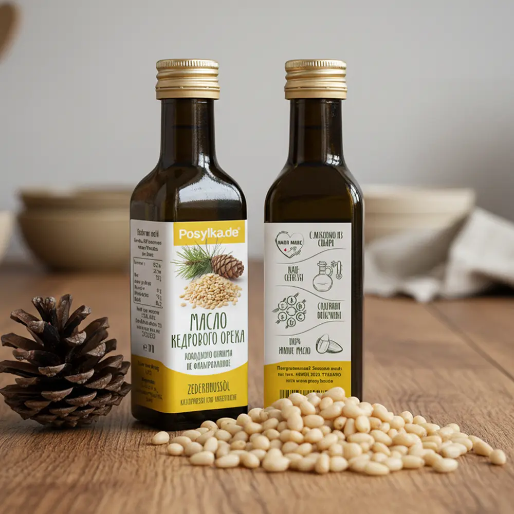 Natürliches Zedernnussöl aus Sibirien, Posylka.de, 100 ml ist ein naturbelassenes Produkt aus erster Kaltpressung, das wegen seiner ursprünglichen Herkunft und seiner milden Wirkung auf den Organismus geschätzt wird. Das Mindesthaltbarkeitsdatum ist auf der Verpackung angegeben; nach dem Öffnen sollte die Flasche gut verschlossen und die empfohlenen Lagerbedingungen sollten eingehalten werden.