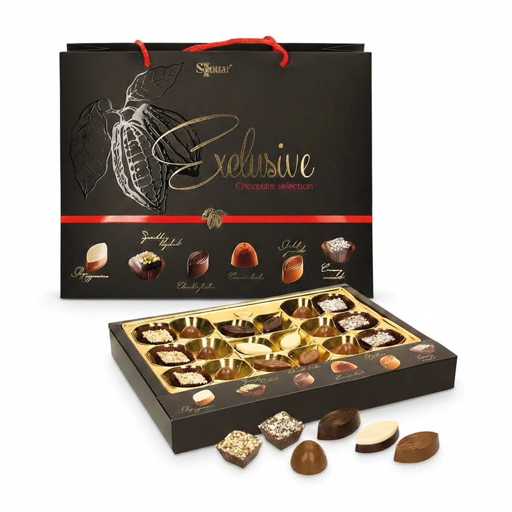 Sehr gelungenes Set, ich hatte "Exclusive Black" zum Tee für einen Familienabend - war in einem Rutsch weg. Die Schokolade schmeckt intensiv, die Pralinen sind frisch, der Knack und die Textur machen richtig Freude. Die Füllungen sind vielfältig, aber für diesen Preis sind Qualität und Gesamteindruck einfach über den Erwartungen, die Verpackung sieht hochwertig aus und man kann es ohne Weiteres verschenken.