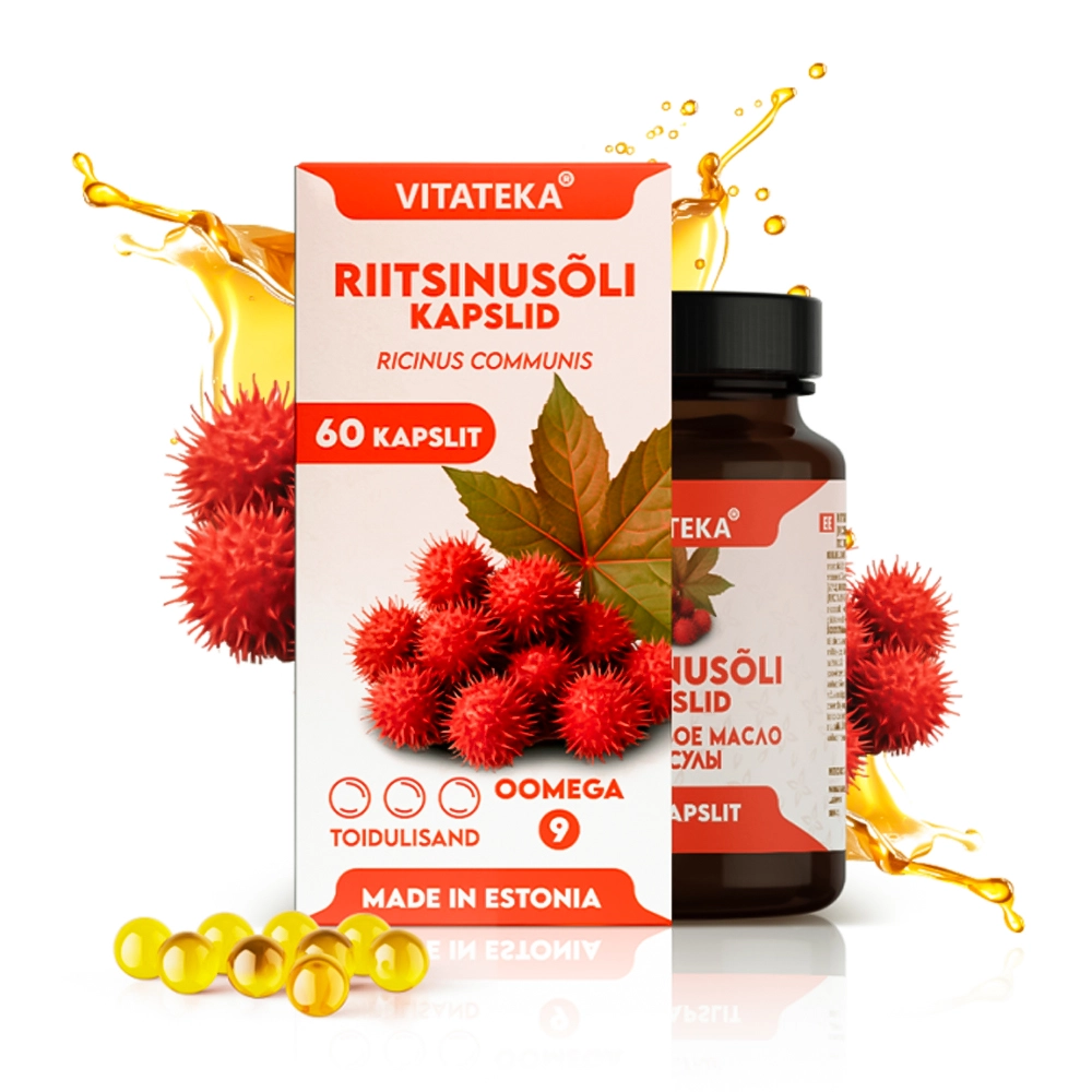 Kaltgepresstes Rizinusöl (Ricinus Communis), Antioxidans: Tocopherolextrakt, Kapselmaterial – Gelatine, Feuchthaltemittel (Glycerin), Wasser.