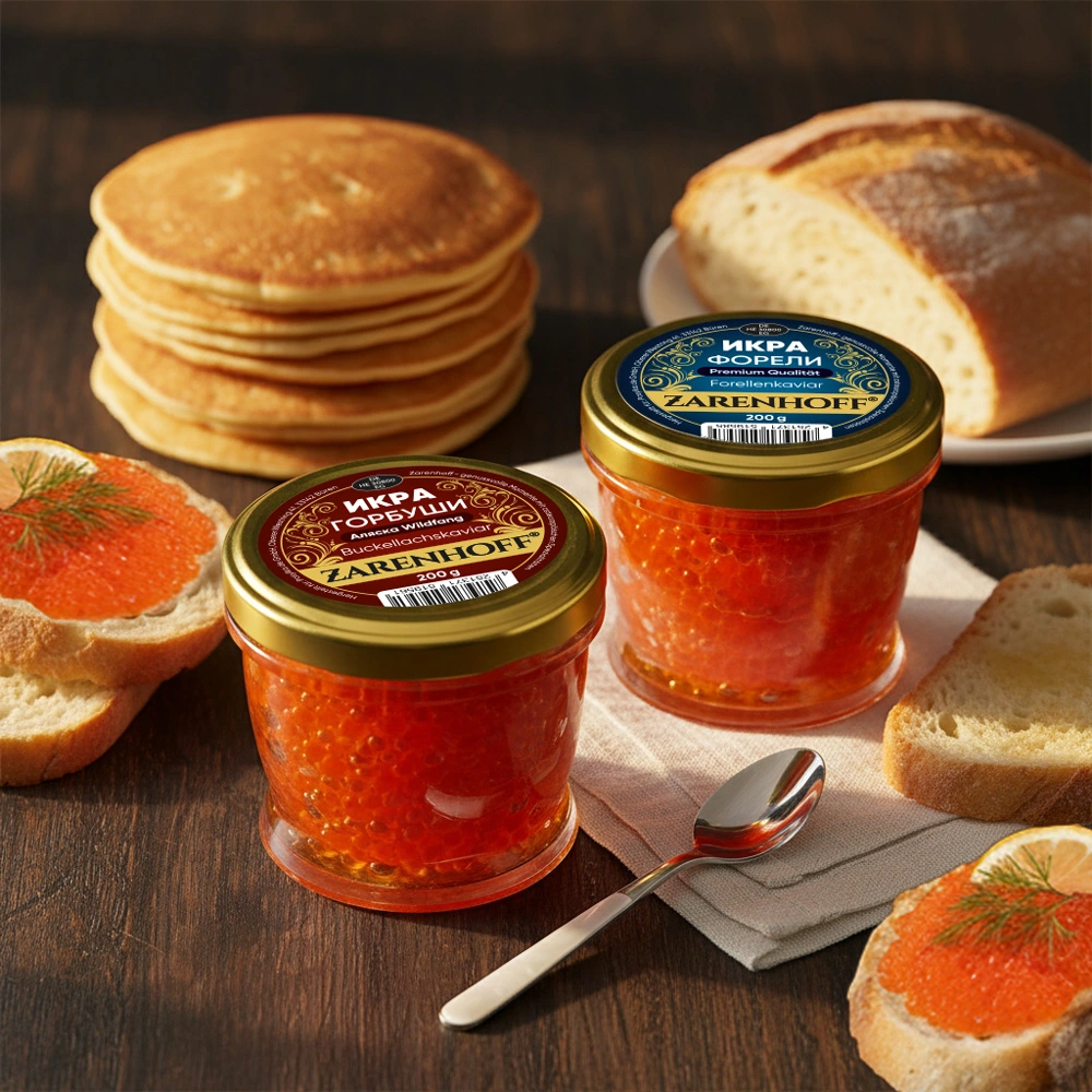 Zutaten: Lachsrogen (Oncorhynchus gorbuscha), Salz, Konservierungsstoff E200.