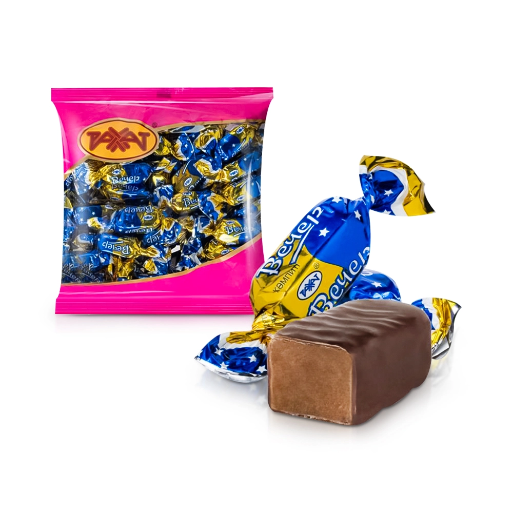 Zutaten: Palmöl, Sojalecithine, Speisesalz, Aromа, Butter, E492, E476, Kakaomasse, Gezuckerte Kondensmilch (Vollmilch, Magermilch, Zucker, Laktose), fettarmes Kakaopulver Maisstärke, Glucosesirup, Baumwollsamenöl, Ethanol 0,6 %, Feuchtigkeitsregler Invertase, Beerentinktur 0,4%, Cognac 0,2 %