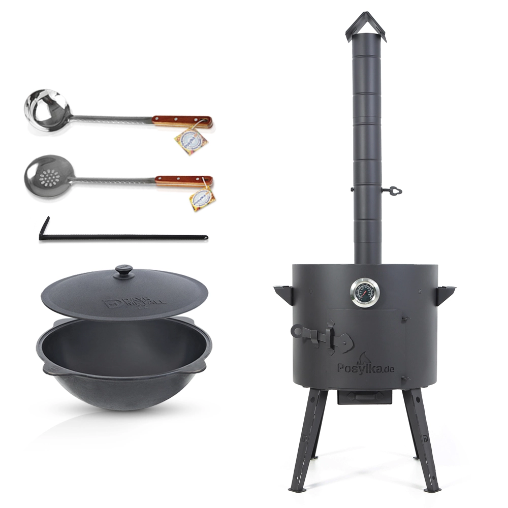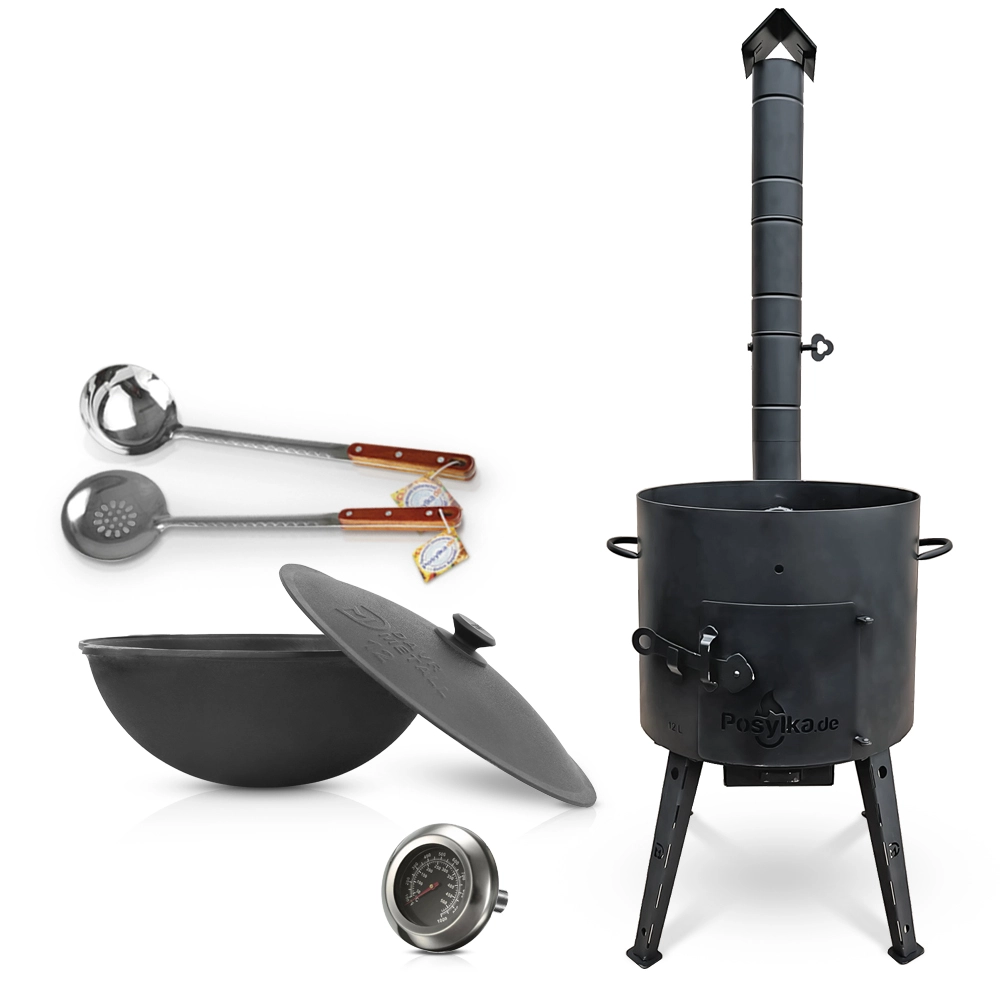 Set 4 in 1: Feuerofen mit Thermometer, Asia-Kasan mit Deckel 12 L, usbekische Schöpfkelle 1 Stk., usbekischer Schaumlöffel 1 Stk.