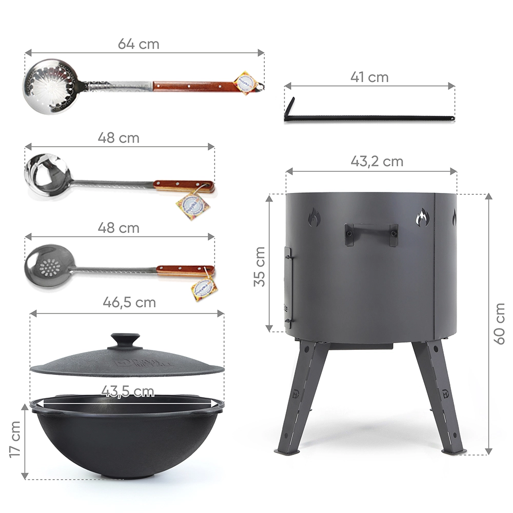 Set - Feuerofen - KasanoFF, 16 Liter, Ø 44 cm + Gusseisenkessel, flacher Boden, Ø 46,5 cm, 16 l + Schaumlöffel: 2 Stk. + Schöpfkelle