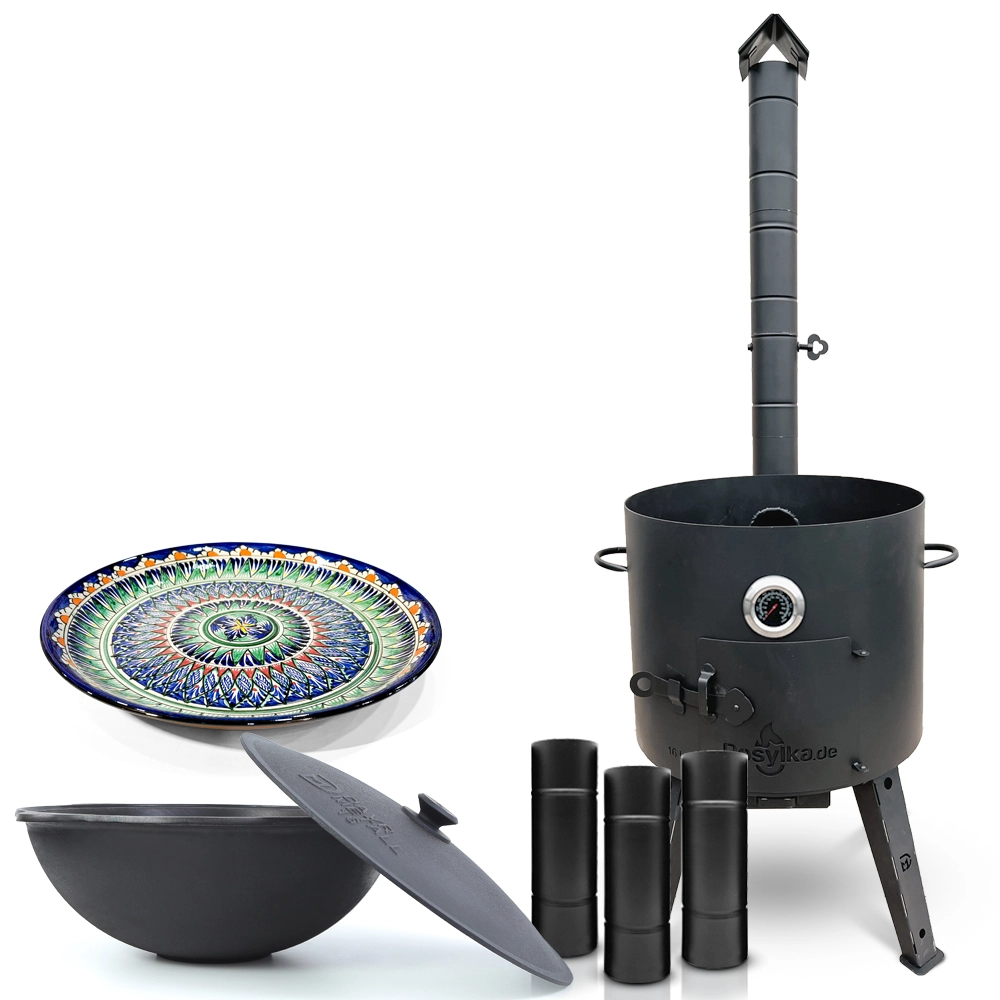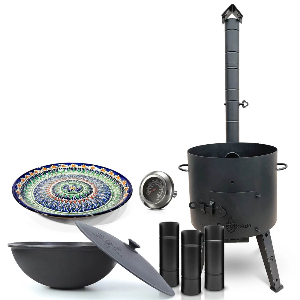 Set - Feuerofen - KasanoFF, 16 Liter, Ø 44 cm + Rohrverlängerung + Gusseisenkasan, flacher Boden, Ø 46,5 cm, 16 l + Thermometer + Lagan MIX-Muster, Ø