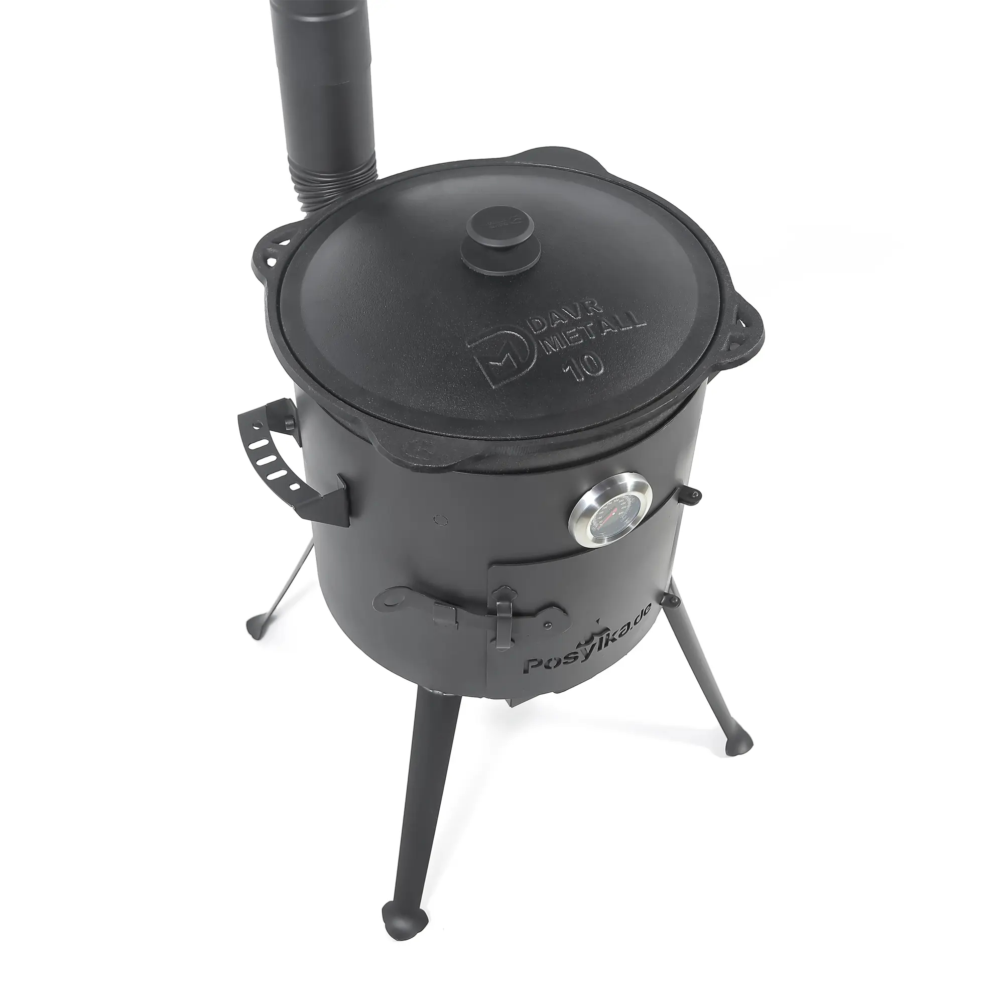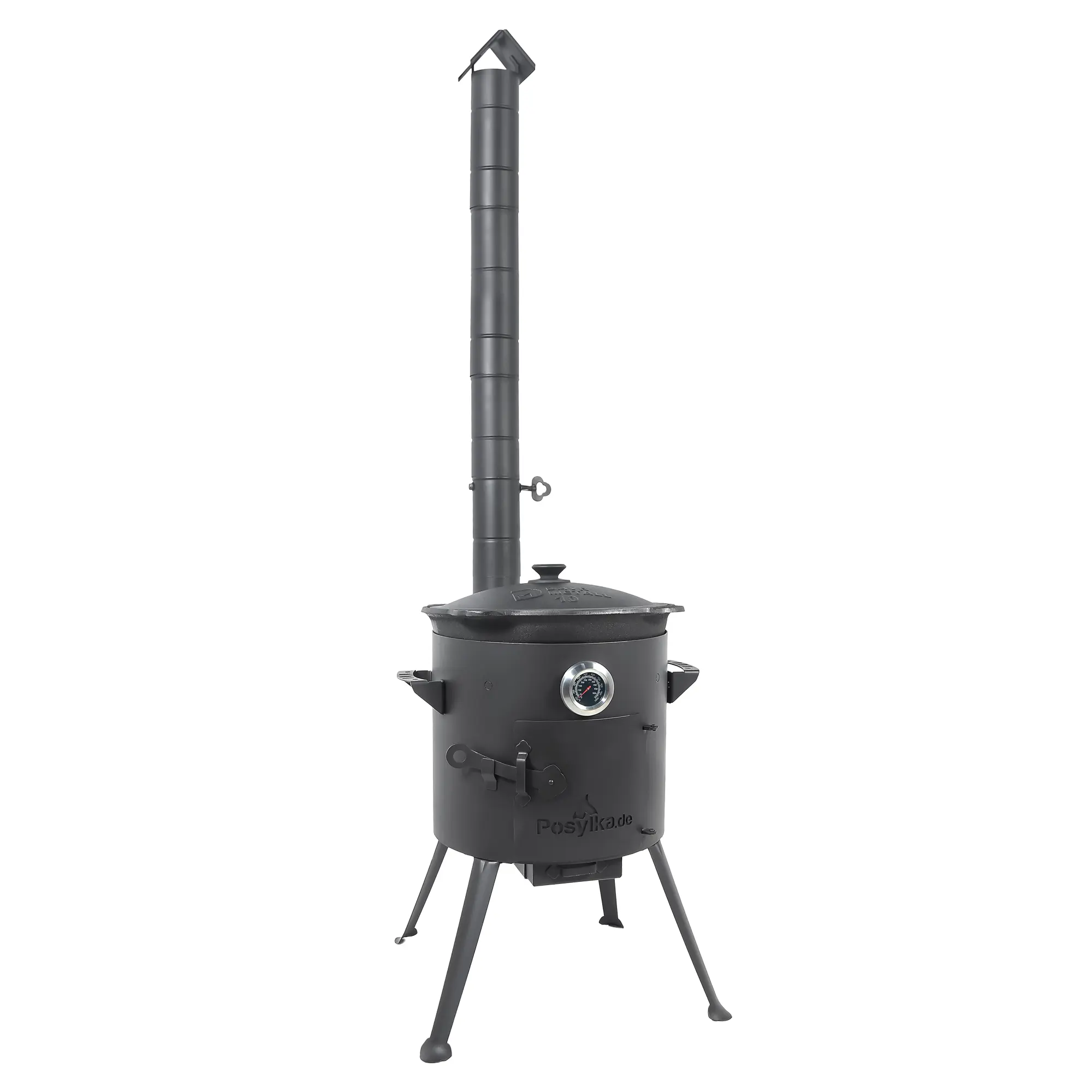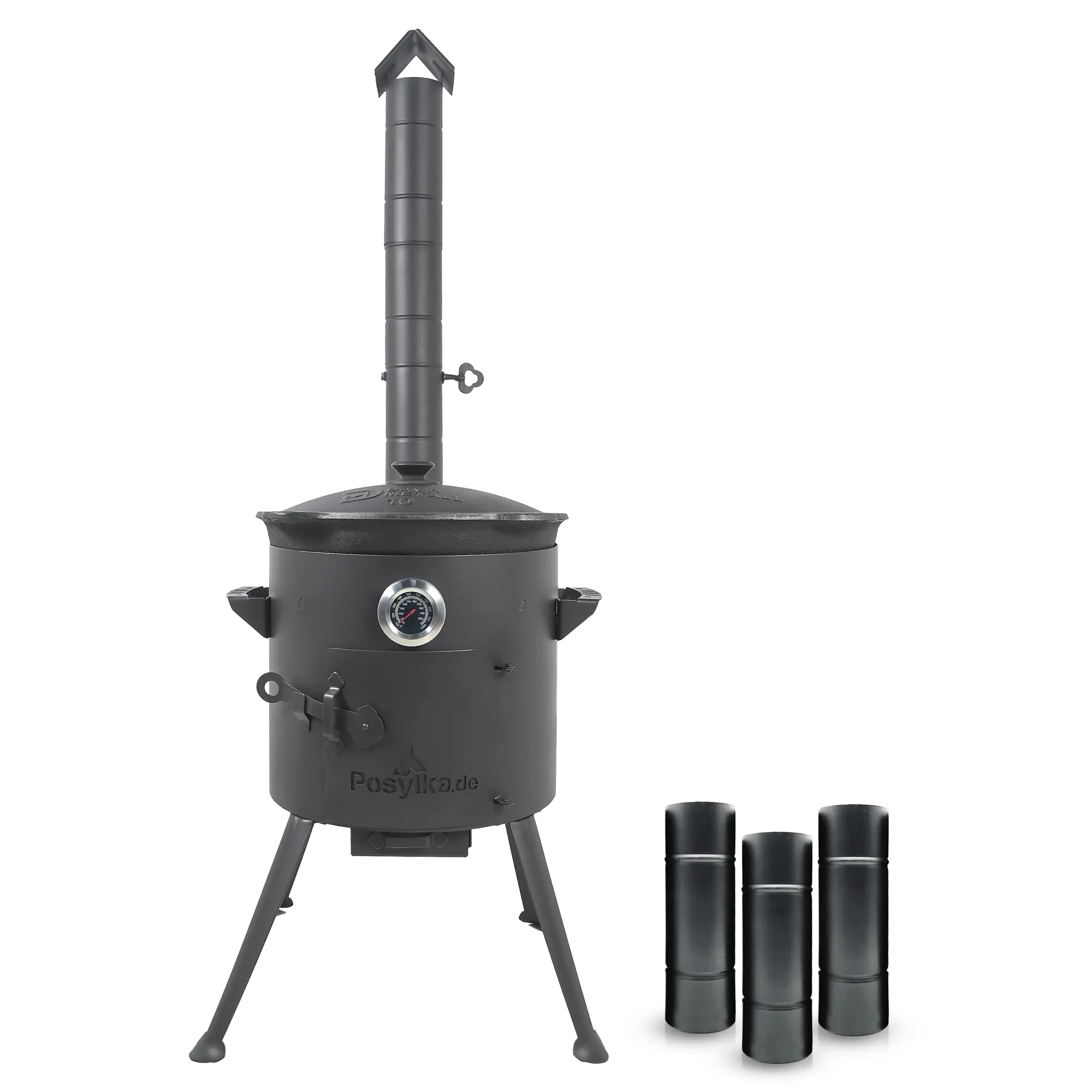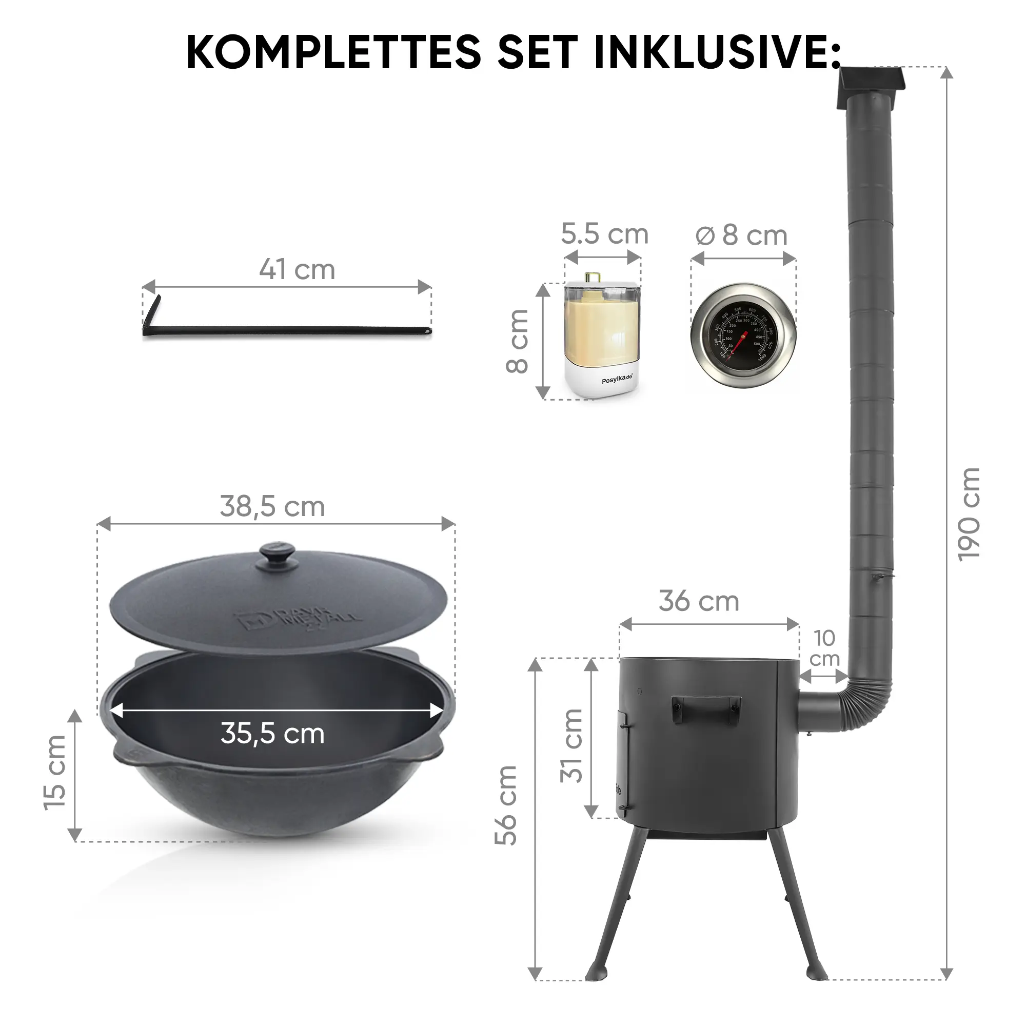 Utschak Feuerofen Ø 36 cm + Gusseisen-Kasan 10 L, runder Boden + Küchenzubehör, Usbekischer Kochtopf aus Gusseisen für Grill & Plov