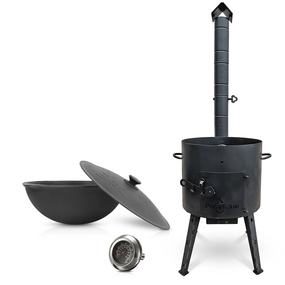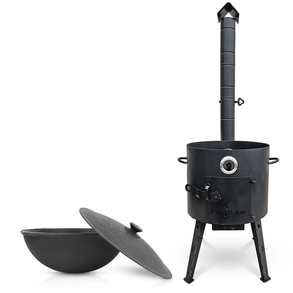 Set - Feuerofen- KazanoFF, für Kasan 12 Liter, Ø 40 cm + Thermometer + Gusseisenkasan, Aluminiumdeckel, runder Boden, Ø 42,5 cm, 12 l