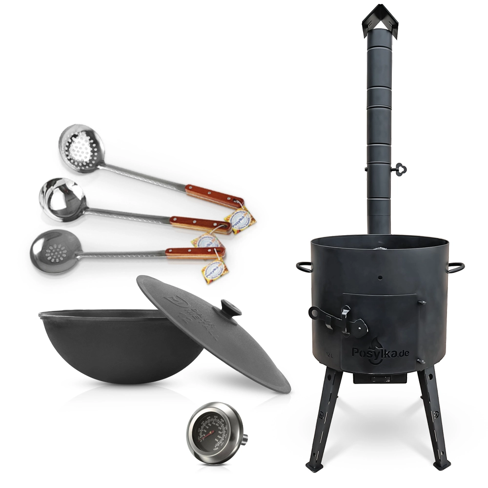 Set - Feuerofen- KazanoFF, für Kasan 12 Liter, Ø 40 cm + Thermometer + Gusseisenkasan, runder Boden, Ø 42,5 cm, 12 l + Schaumlöffel: 2 Stk. + Schöpfk