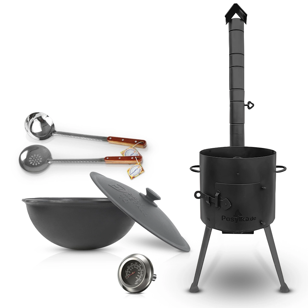 Set - Feuerofen- KazanoFF, für Kasan10 Liter, Ø 36 cm + Thermometer + Gusseisenkasan, runder Boden, Ø 38,5 cm, 10 l + Schöpfkelle + Schaumlöffel