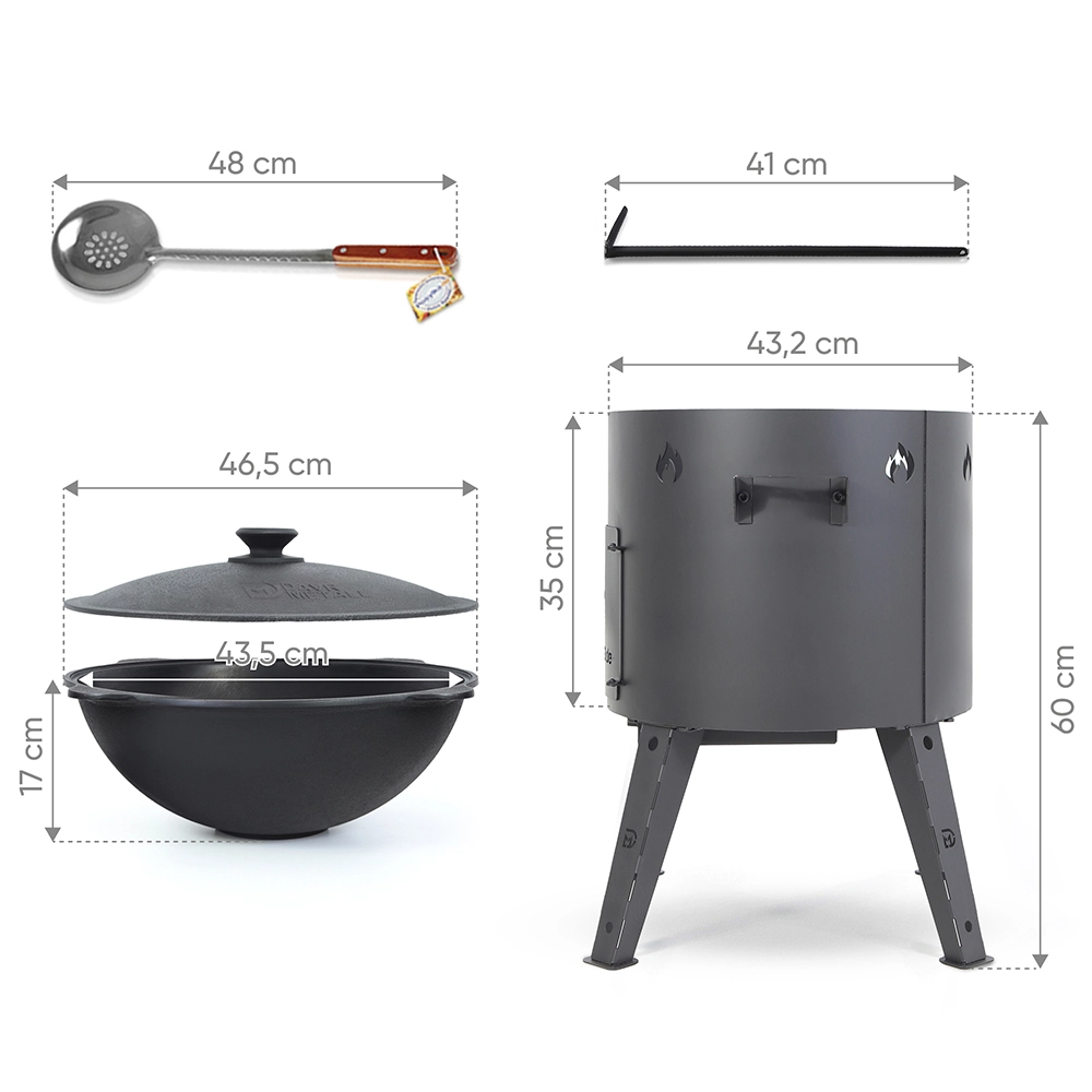 Set - Feuerofen - KazanoFF, für usbekischen Kasan 16 Liter, Ø 44 cm + Gusseisenkasan, Aluminiumdeckel, flacher Boden, Ø 46,5 cm, 16 l + Schaumlöffel 4