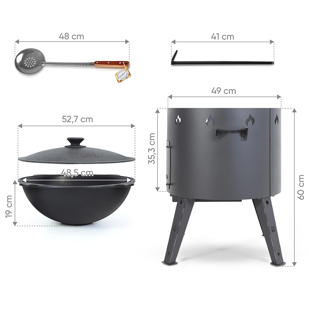 Set: Feuerofen Utschak Ø 49 cm, Gusseisen-Kasan 22 L flacher Boden, Kochaccessoires