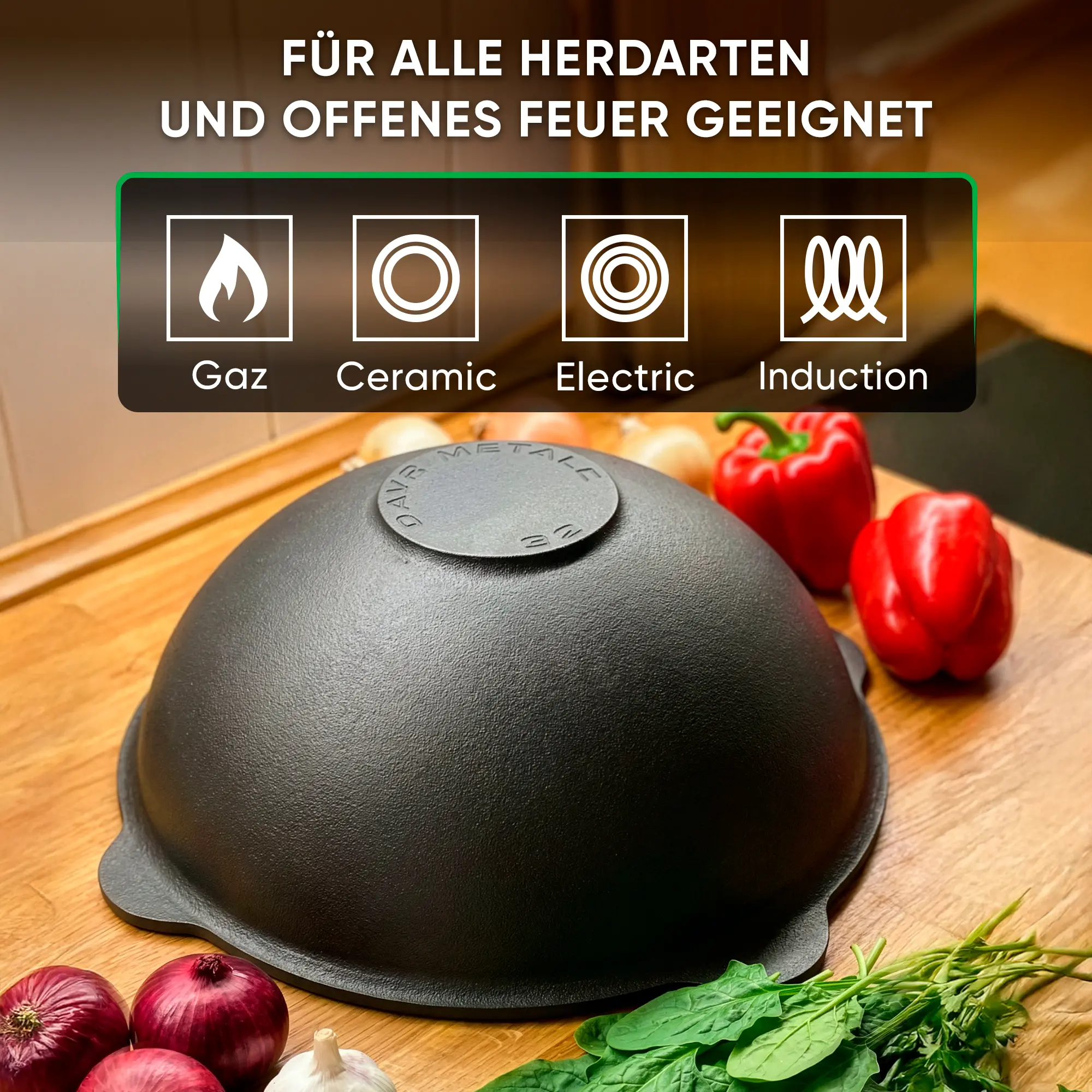 Set - Gusseisenkasan, Aluminiumdeckel, flacher Boden, 22 l, Ø 52,7 cm + Schaumlöffel 48 cm