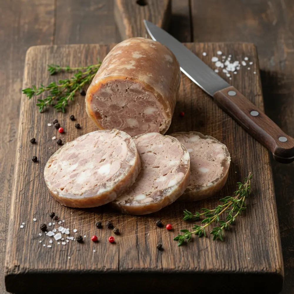 Schweinefleisch 60 %, Speck, Trinkwasser, Gewürze, Knoblauch, Schwarten, Salz, Geschmacksverstärker Mononatriumglutamat