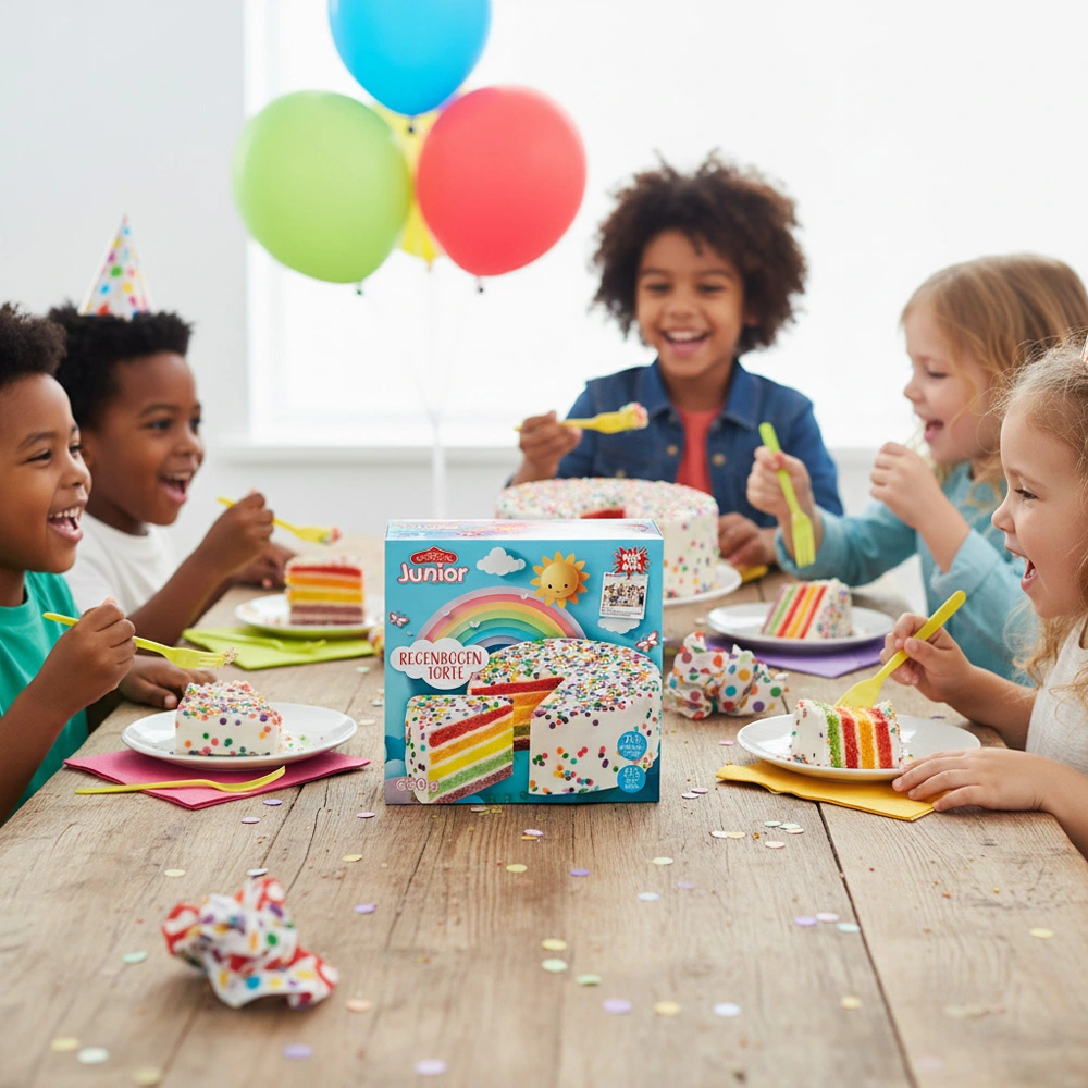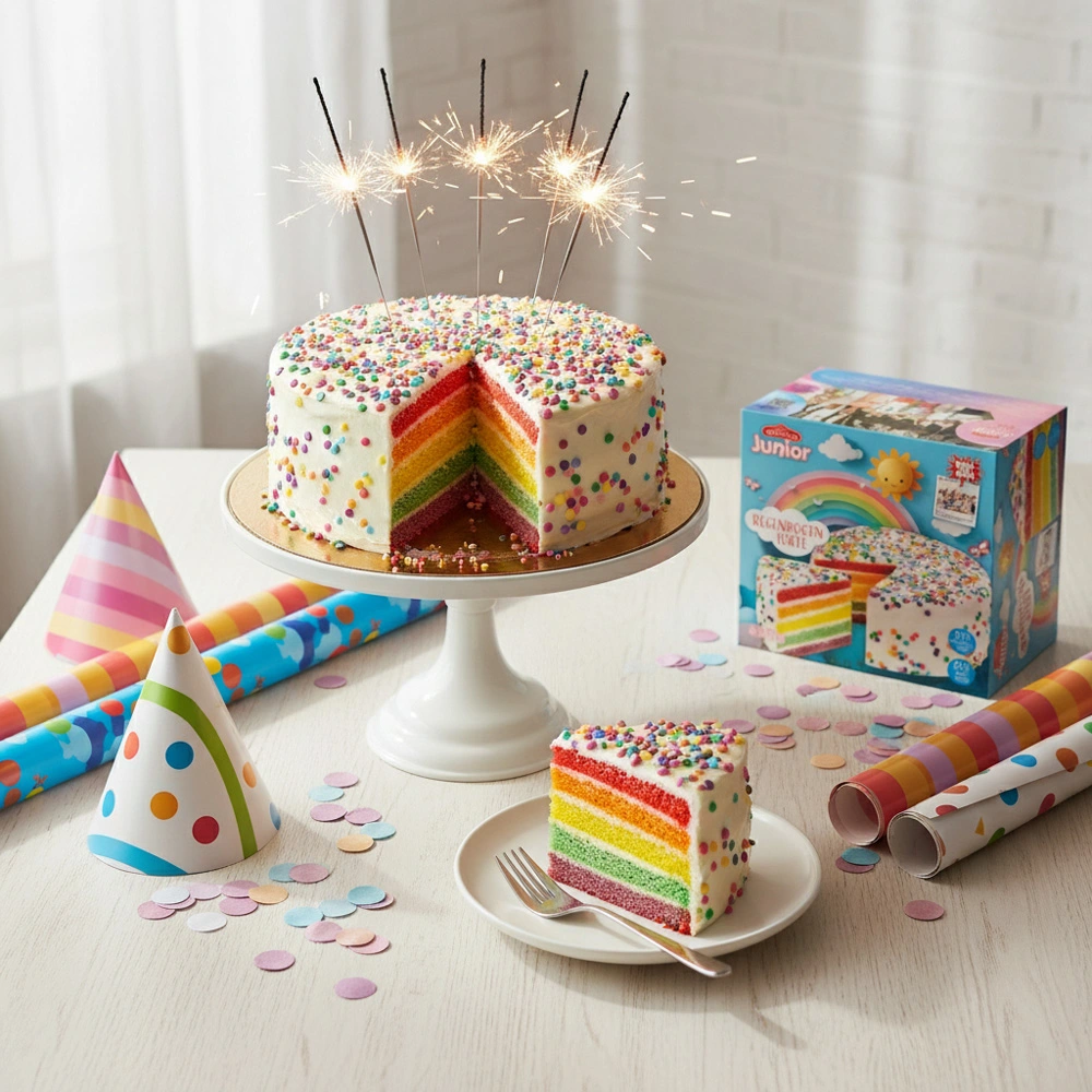 Entdecken Sie die farbenfrohe Welt der DOVGAN Junior Regenbogentorte – ein süßer Traum in Schichten! Diese tiefgefrorene Schichttorte aus luftigem Biskuitteig beeindruckt nicht nur durch ihren lebhaften Regenbogen-Look, sondern auch durch ihren köstlichen Geschmack. Jede Schicht ist perfekt aufeinander abgestimmt und mit einer zarten Frischkäsecreme gefüllt, die eine himmlische Balance zwischen süß und cremig bietet. Die weiße Glasur umhüllt die Torte elegant und wird durch bunte Zuckerstreusel abgerundet, die für den besonderen Knusper-Effekt sorgen. Ideal für Kindergeburtstage, Familienfeiern oder einfach, um Farbe in den Alltag zu bringen – die DOVGAN Junior Regenbogentorte ist ein Genuss, der Groß und Klein begeistert!