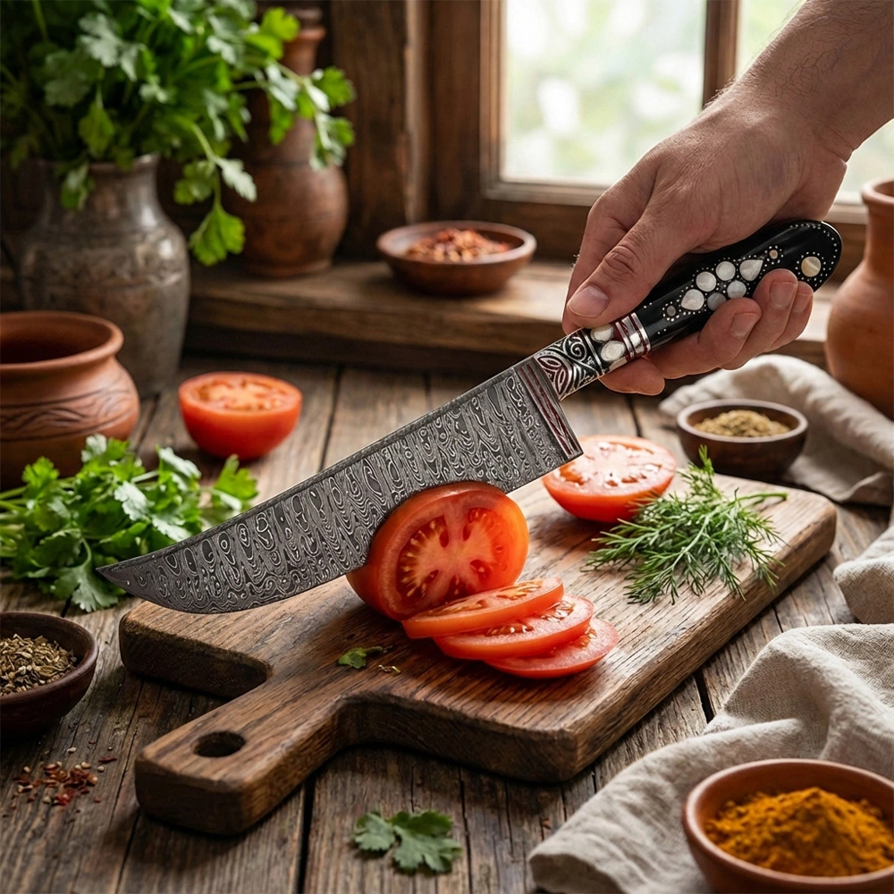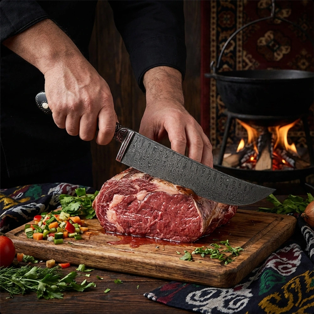 Usbekisches Pchak-Messer, 28 cm - vielseitiger Helfer in Küche und Outdoor. Die klassische usbekische Form, eine robuste Damastklinge und ein handlicher Griff machen es zu einem vollwertigen Arbeitsmesser, nicht nur zu einem Souvenir.