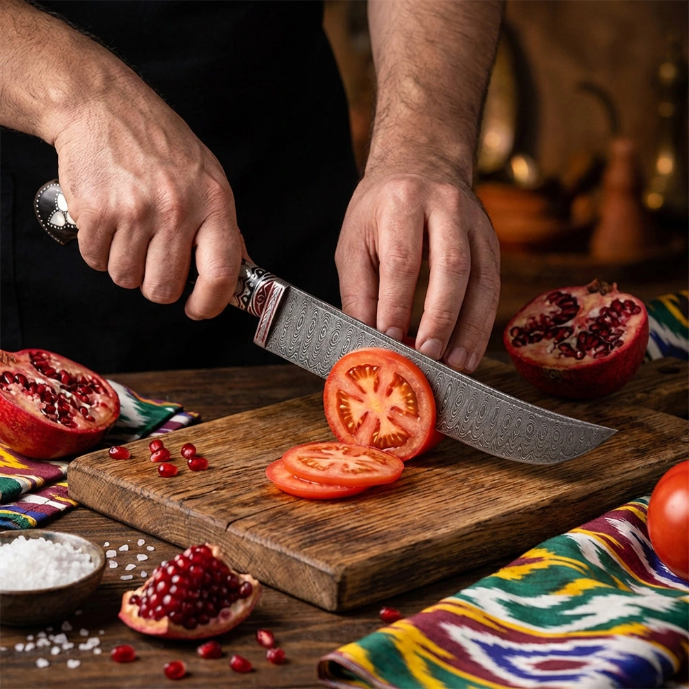 Usbekisches Messer Pchak 31 cm - ein vielseitiges Messer für Küche und Outdoor-Einsatz, gefertigt nach traditionellen usbekischen Vorbildern. Es schneidet Gemüse, Fleisch und Kräuter gleichermaßen zuverlässig und kann so mehrere Küchenmesser ersetzen.