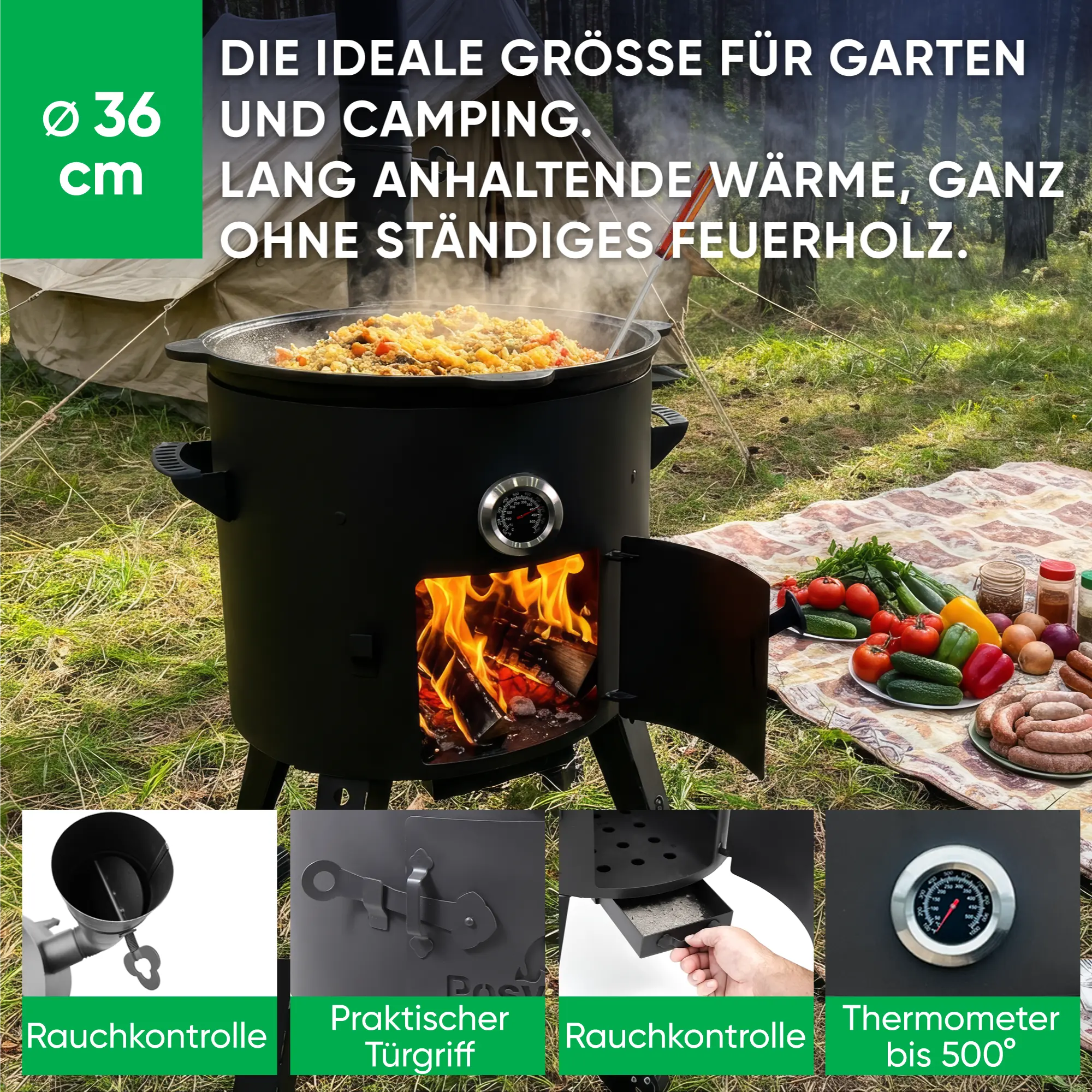 Utschak Feuerofen Ø 36 cm + Gusseisen-Kasan 10 L, flacher Boden + Küchenzubehör, Usbekischer Kochtopf aus Gusseisen