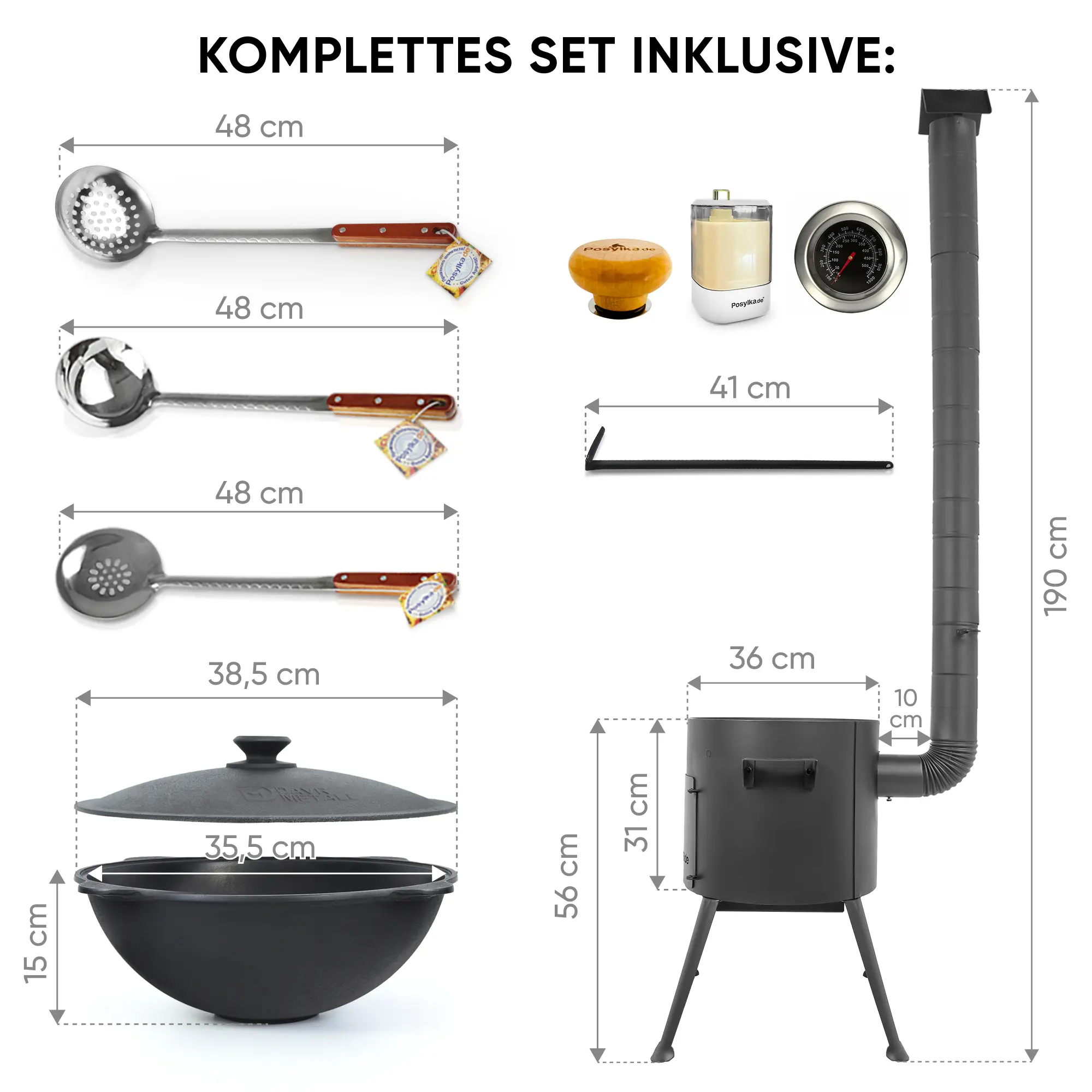 Deckel: 1 Stk., Kugelschreiber: 1 Stk., Feuerhaken 41 cm, Verlängerungsrohr, Thermometer, Automatischer Zahnstocherspender, Utschak Ø 36 cm, Schaumlöffel für Plov, tief, 48 cm, Kasan Ø 36,7 см, 10 л, Schaumlöffel für Plov, 48 cm, Schöpfkelle für Plov, 48 cm