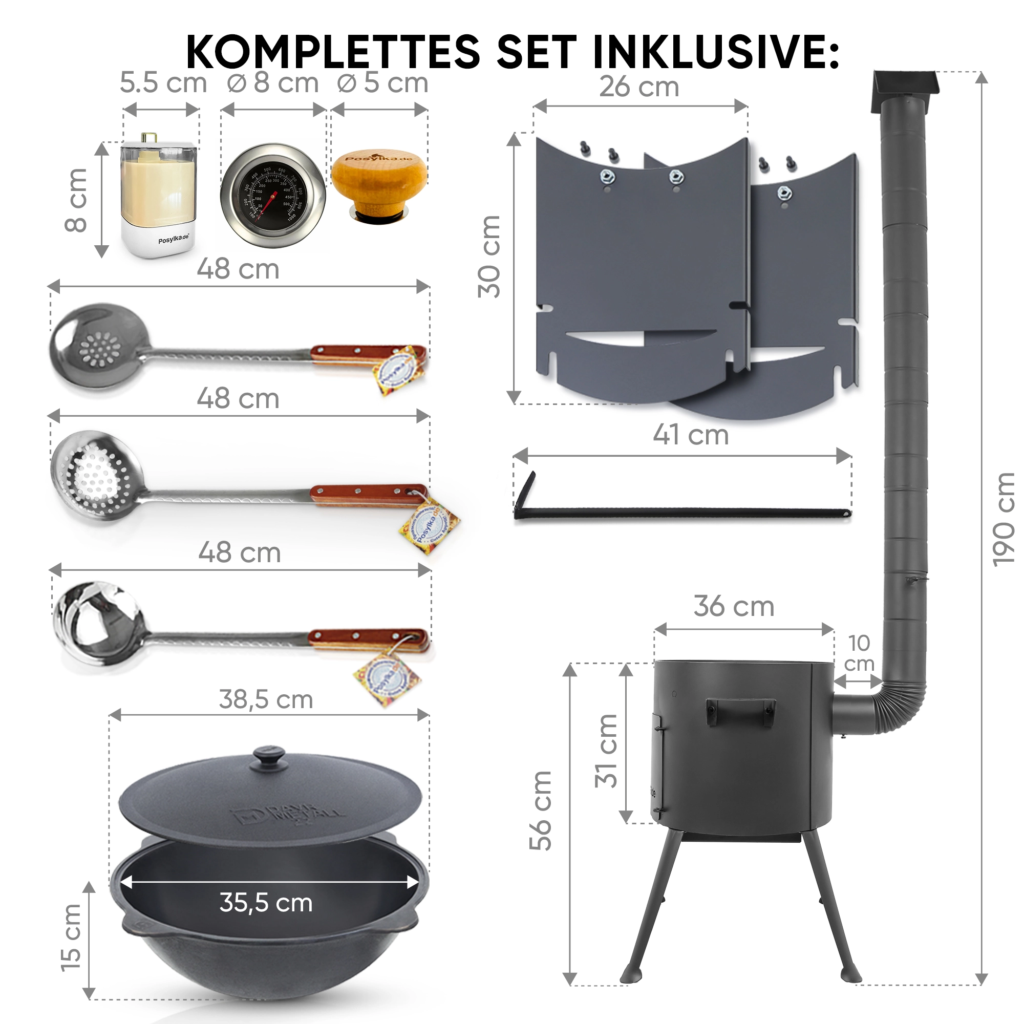 Utschak Feuerofen Ø 36 cm + Gusseisen-Kasan 10 L, runder Boden + Küchenzubehör, Usbekischer Kochtopf aus Gusseisen