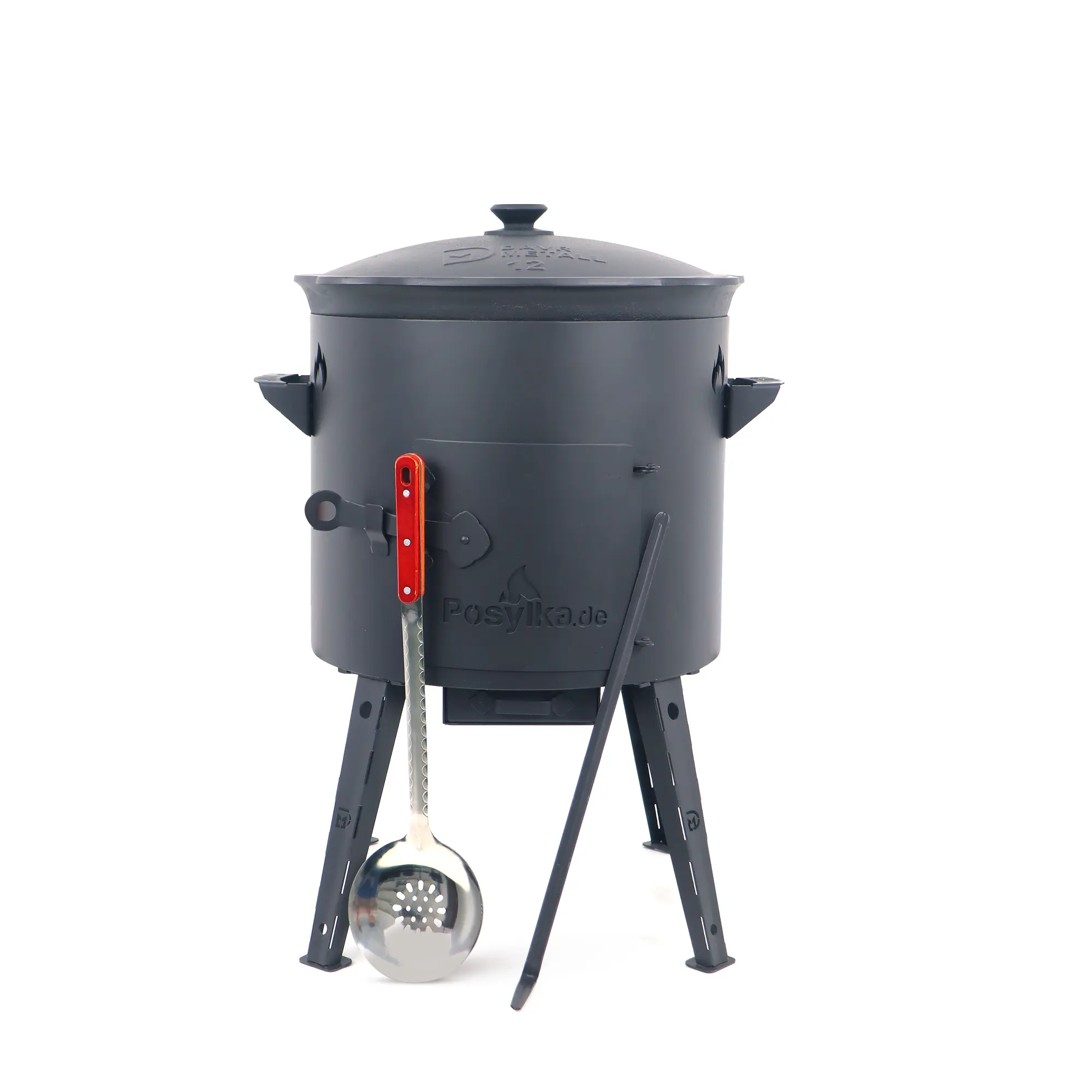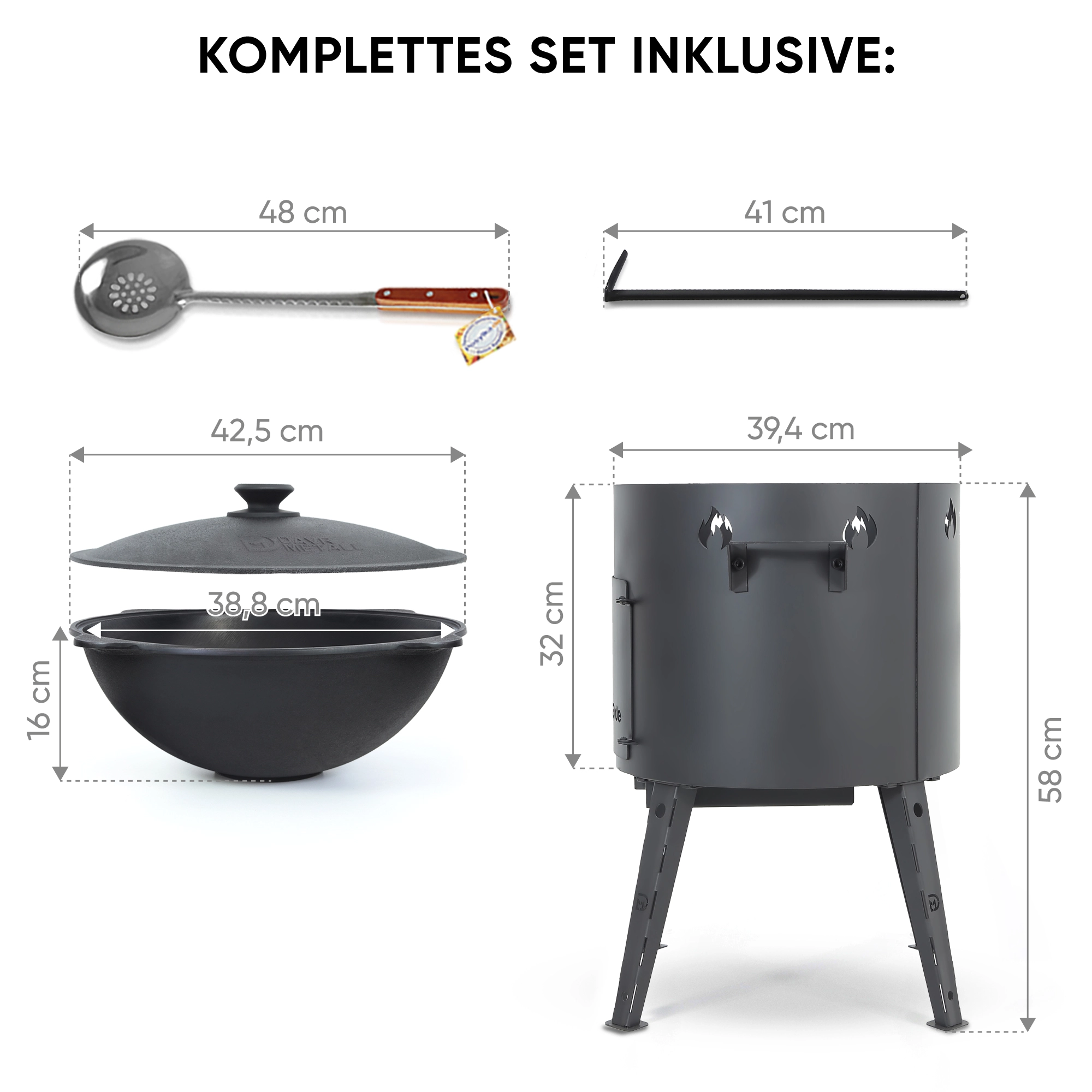 Utschak Feuerofen Ø 40 cm + Gusseisen-Kasan 12 L, Ø 42,5 cm, flacher Boden + Küchenzubehör, Usbekischer Kochtopf aus Gusseisen