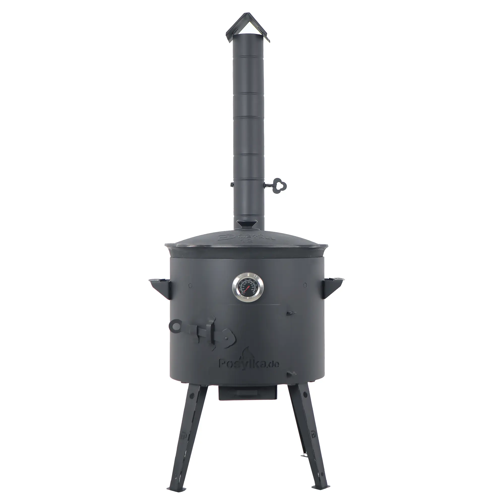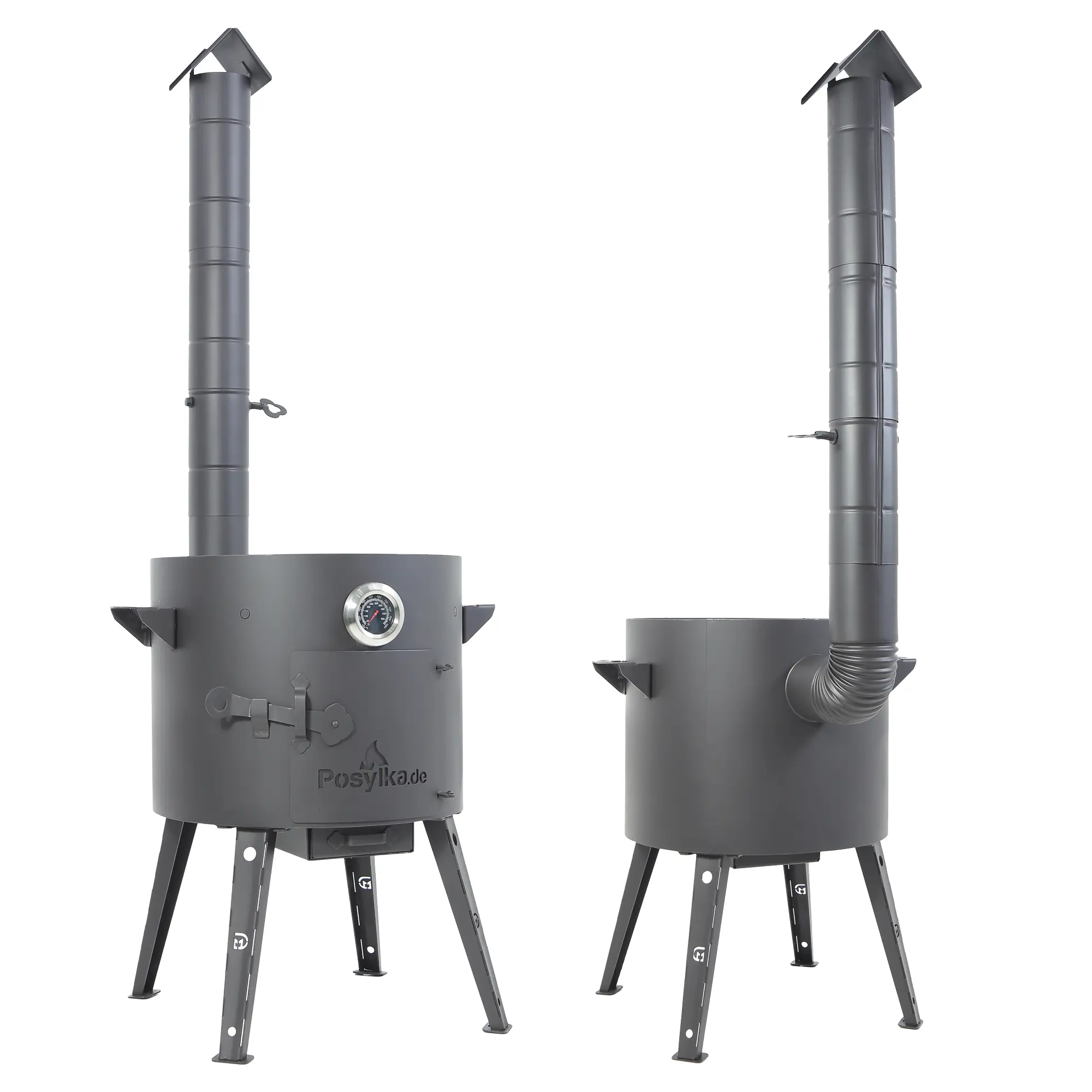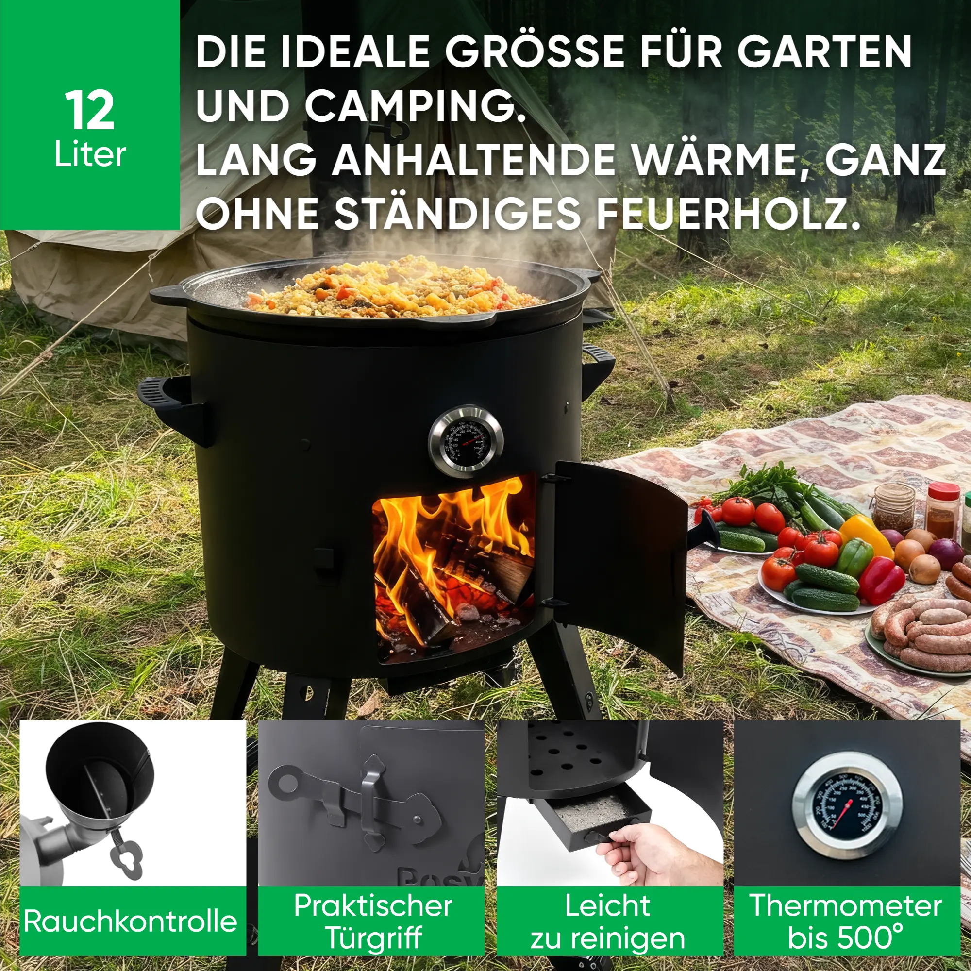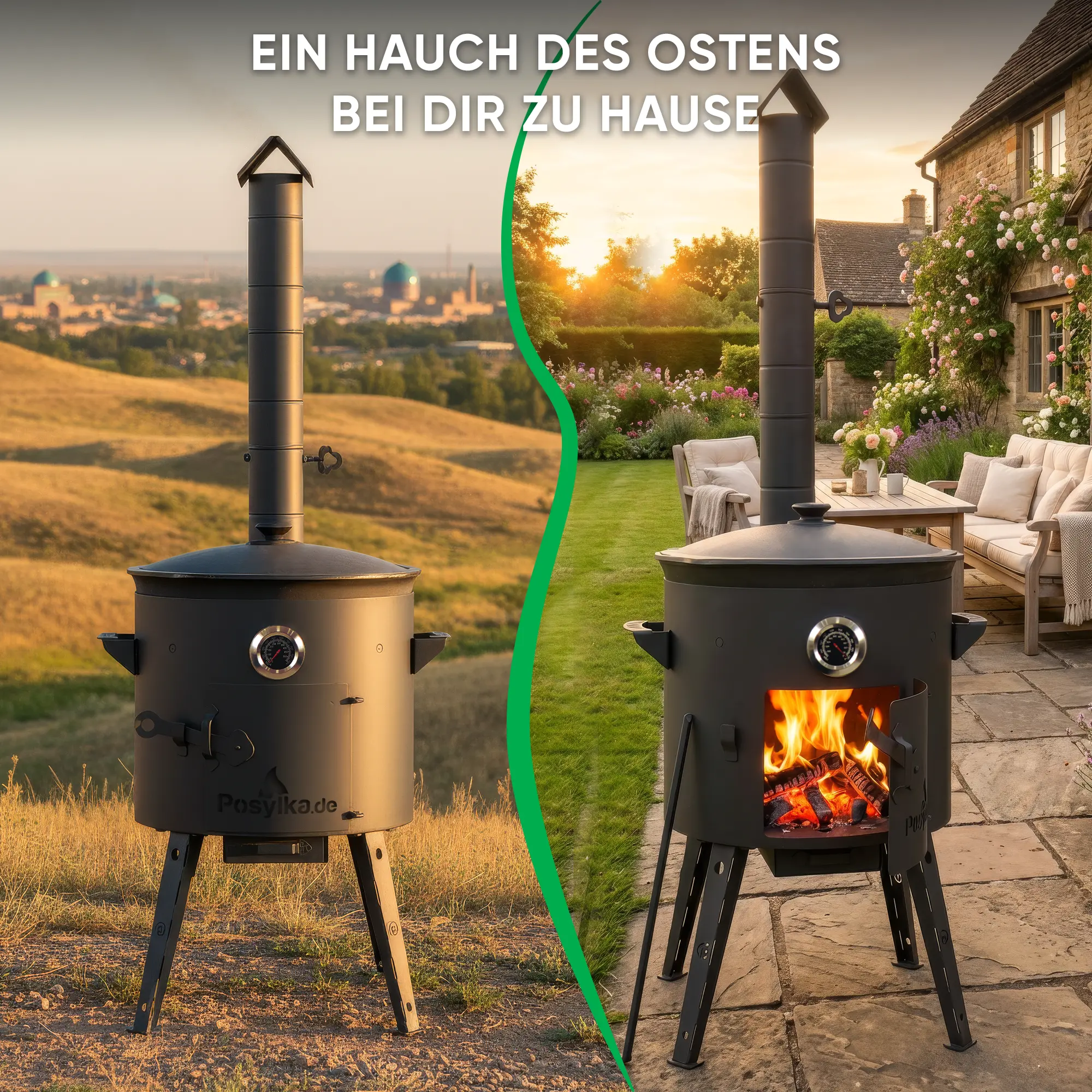 Utschak Feuerofen Ø 40 cm + Gusseisen-Kasan 12 L, Ø 42,5 cm, flacher Boden + Küchenzubehör, Usbekischer Kochtopf aus Gusseisen