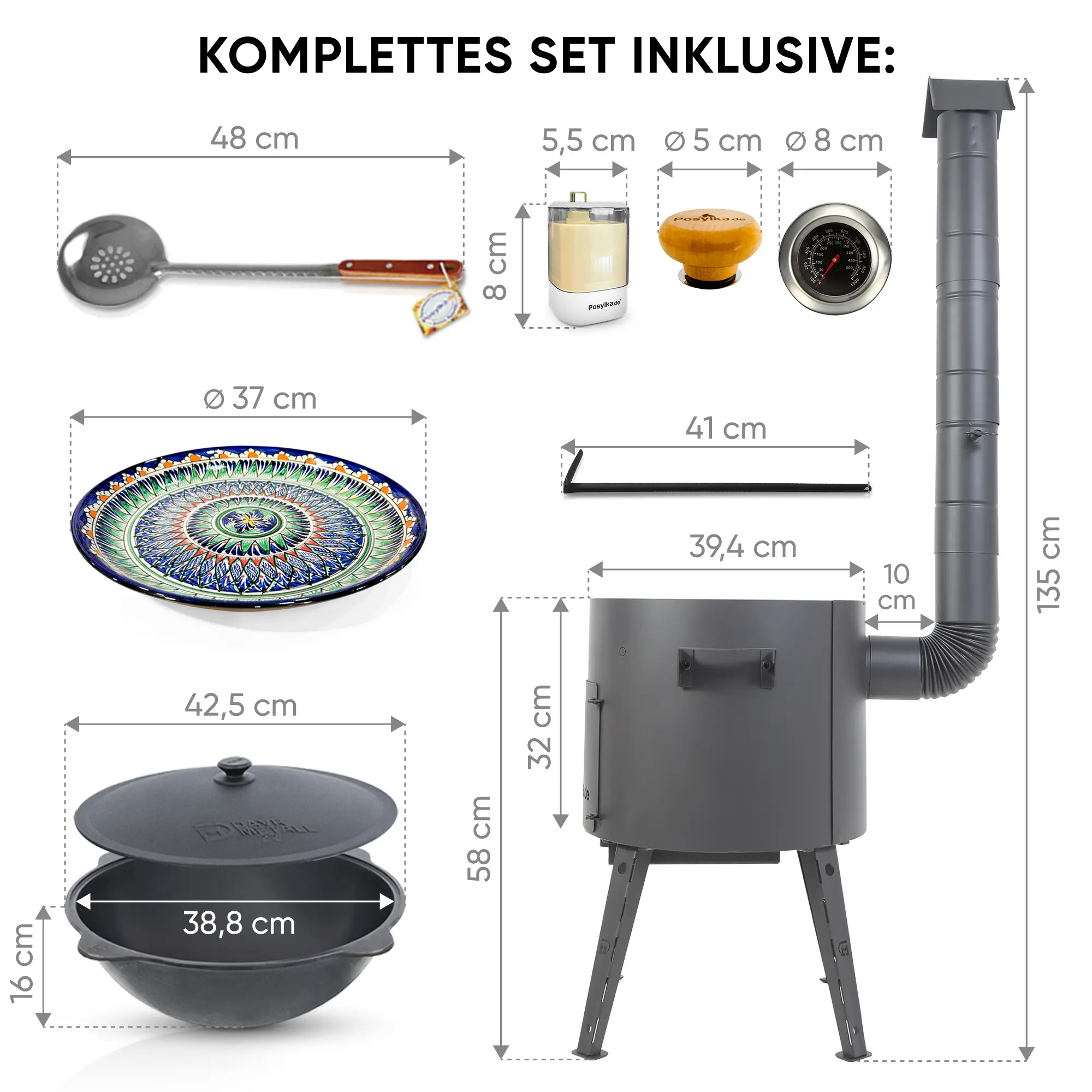 Utschak Feuerofen Ø 40 cm + Gusseisen-Kasan 12 L, Ø 42,5 cm, runder Boden + Küchenzubehör, Usbekischer Kochtopf aus Gusseisen