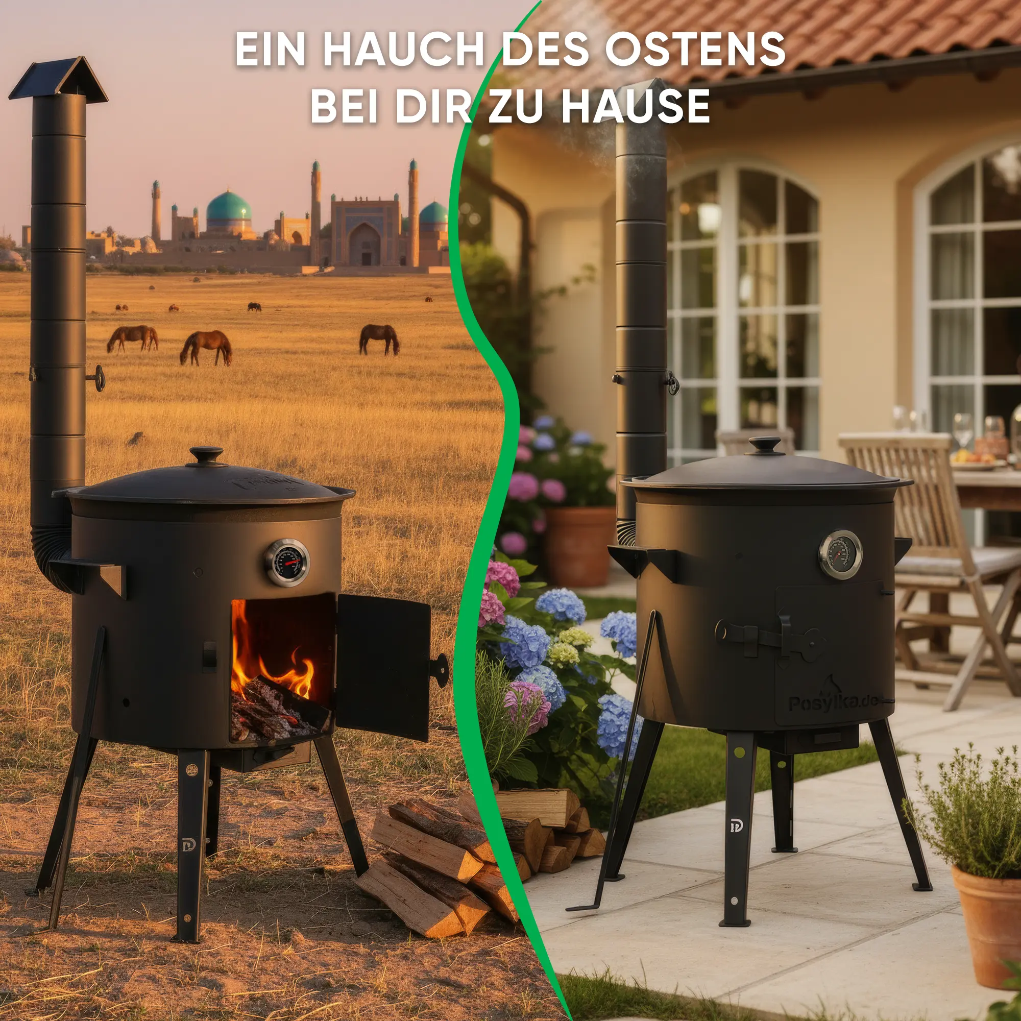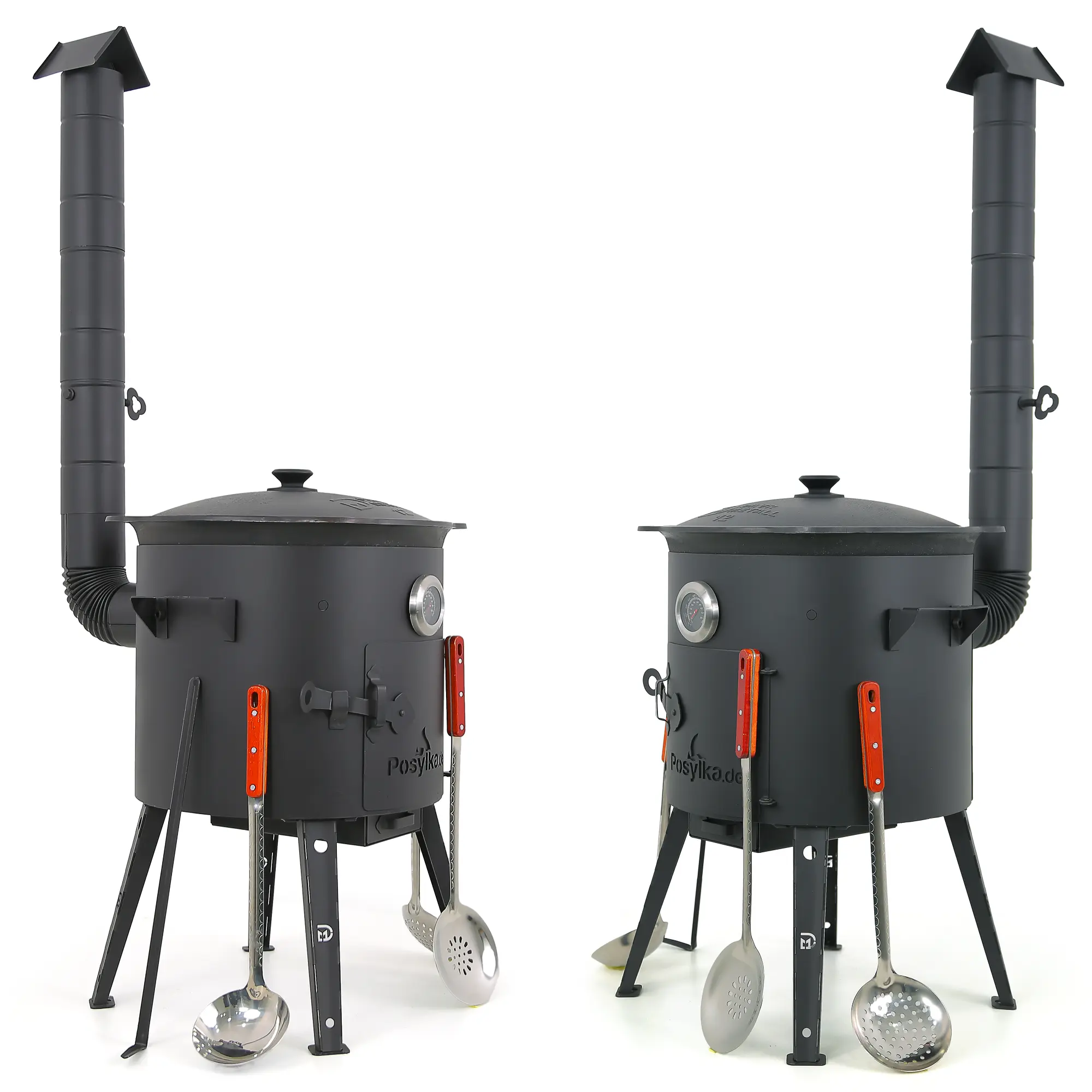 Utschak Feuerofen Ø 40 cm + Gusseisen-Kasan 12 L, Ø 42,5 cm, runder Boden + Küchenzubehör, Usbekischer Kochtopf aus Gusseisen