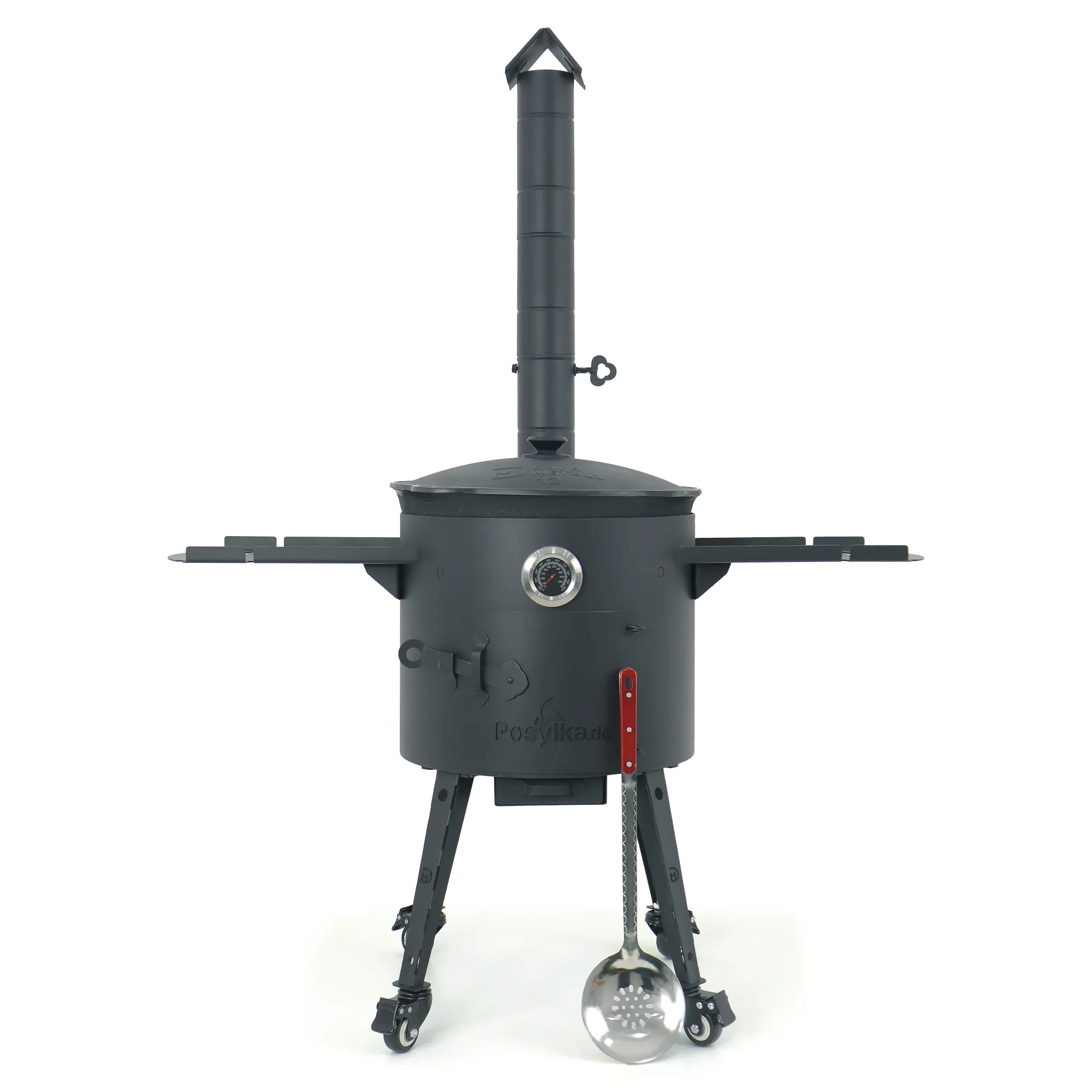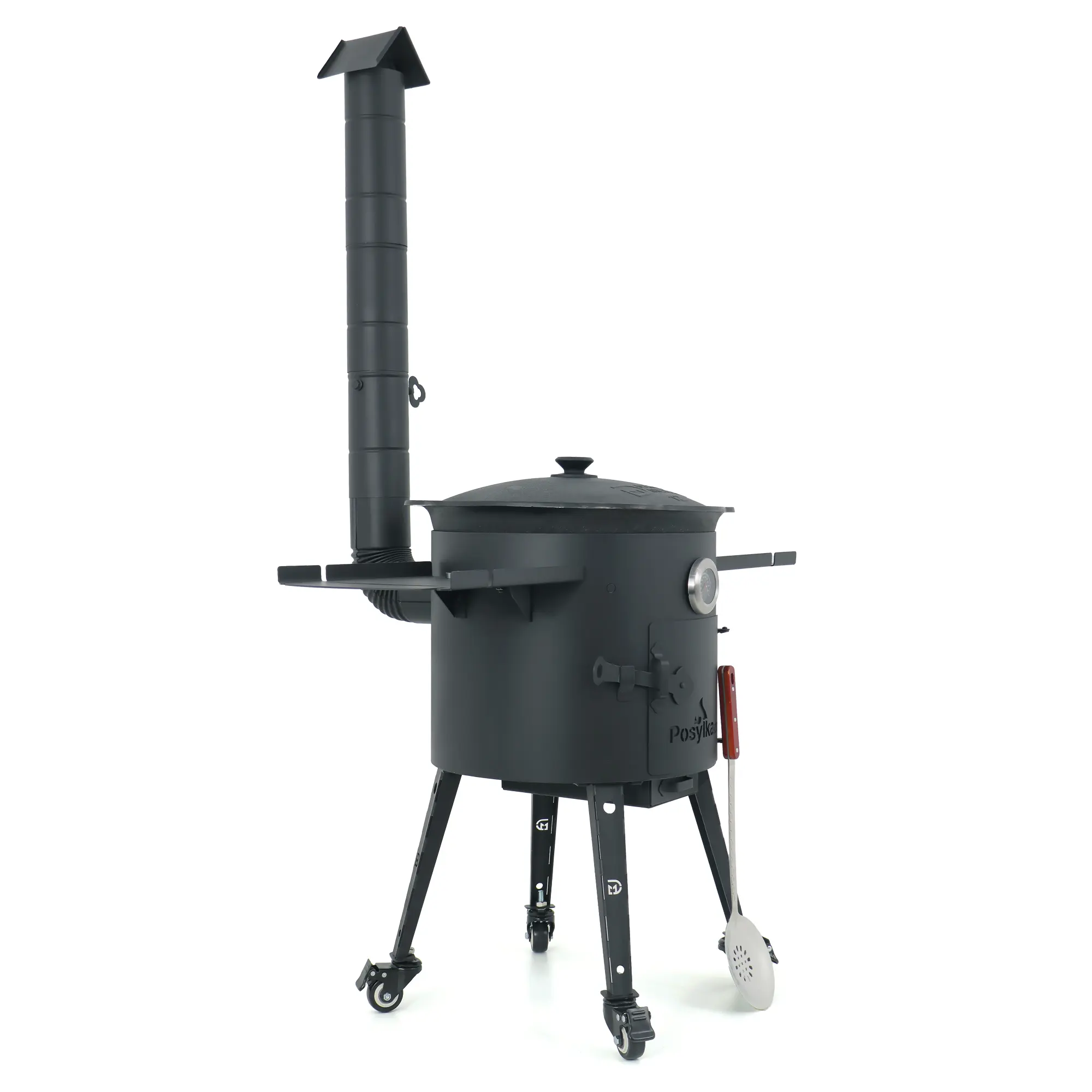 Der KazanоFF-Ofen mit Schornstein und einem originalen usbekischen gusseisernen Dutch Oven ist ideal zur Zubereitung von Pilaw und anderen Gerichten über offenem Feuer. Der Ofen besteht aus robustem Stahl mit einer Materialstärke von 2 mm. Im Set enthalten sind: ein dickwandiger gusseiserner Kessel mit 12-Liter-Deckel, zwei multifunktionale Ablagetische, Transportrollen für bequemes Bewegen, ein hitzebeständiges Thermometer, eine originale usbekische Schöpflöffel, sowie ein automatischer Zahnstocher-Spender.