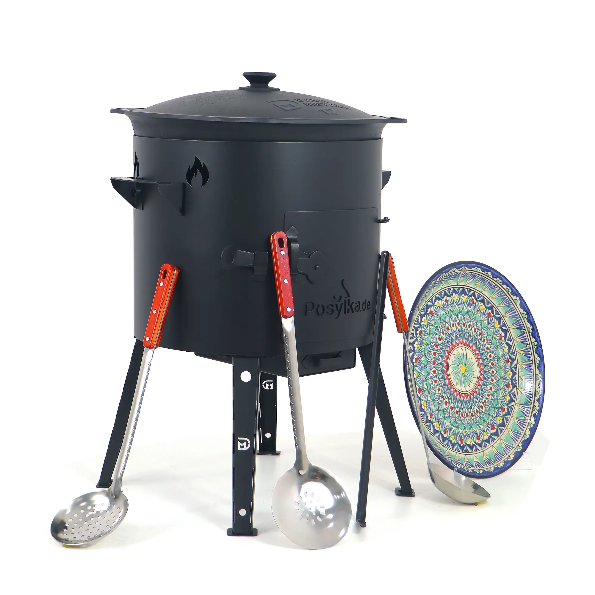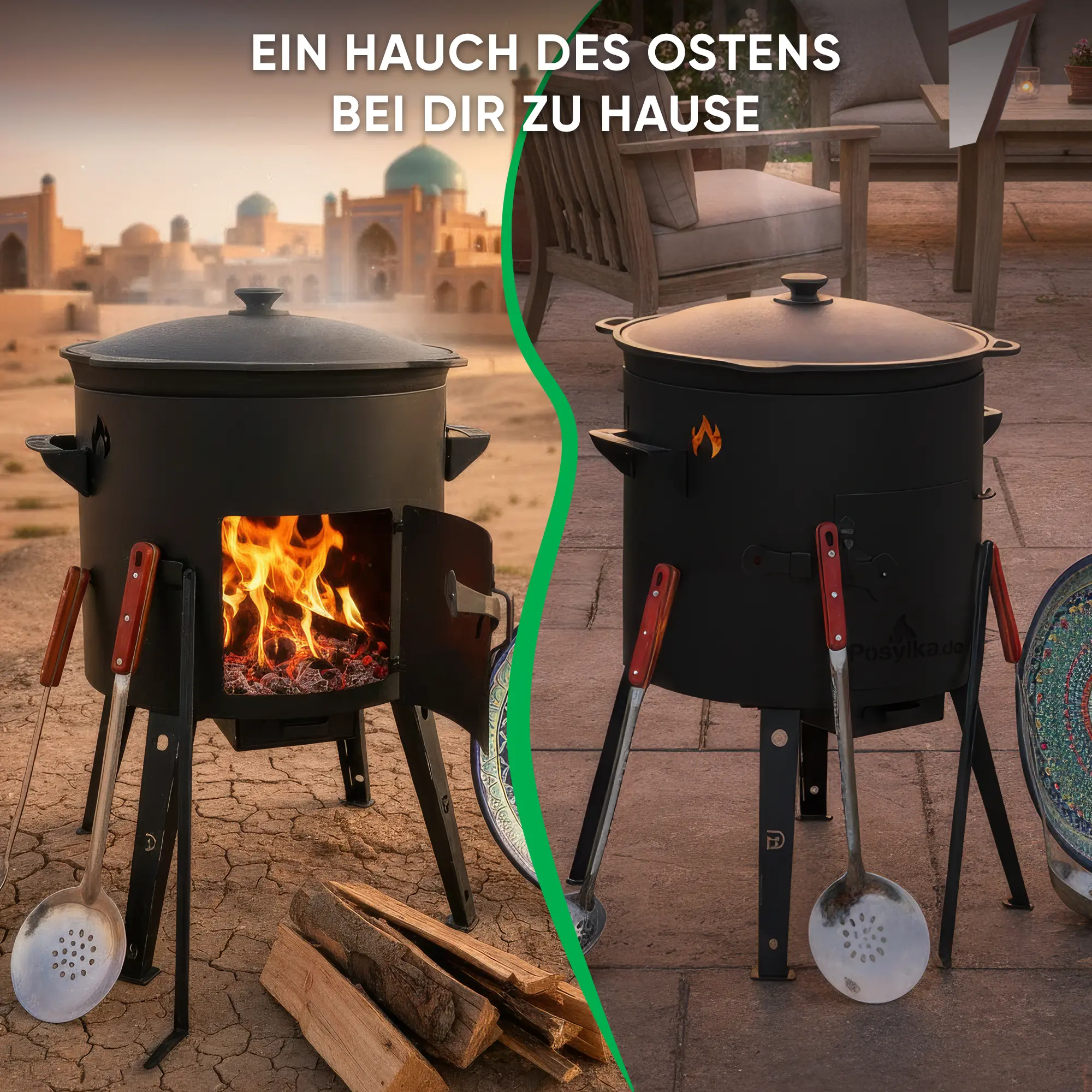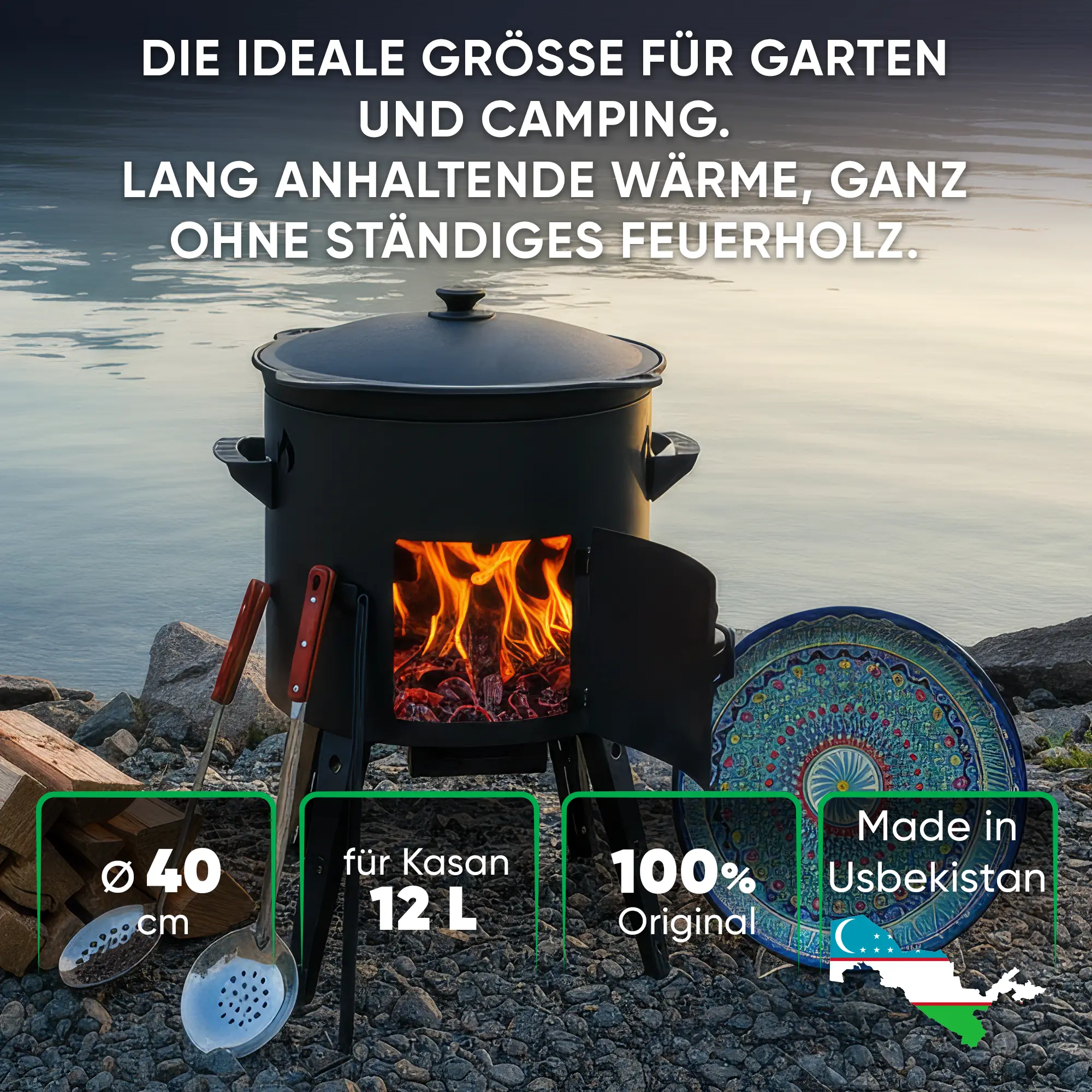 Utschak Feuerofen Ø 40 cm + Gusseisen-Kasan 12 L, flacher Boden + Küchenzubehör, Usbekischer Kochtopf aus Gusseisen für Grill & Plov