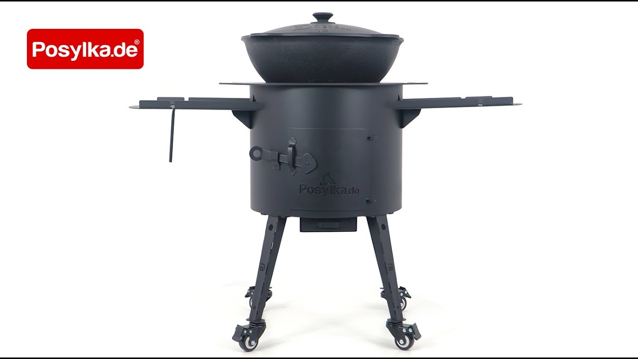 Utschak Feuerofen Ø 40 cm + Gusseisen-Kasan 12 L, runder Boden, Transportrollen, Ablagetische, Ofenplatte + Küchenzubehör, Usbekischer Kochtopf aus Gu